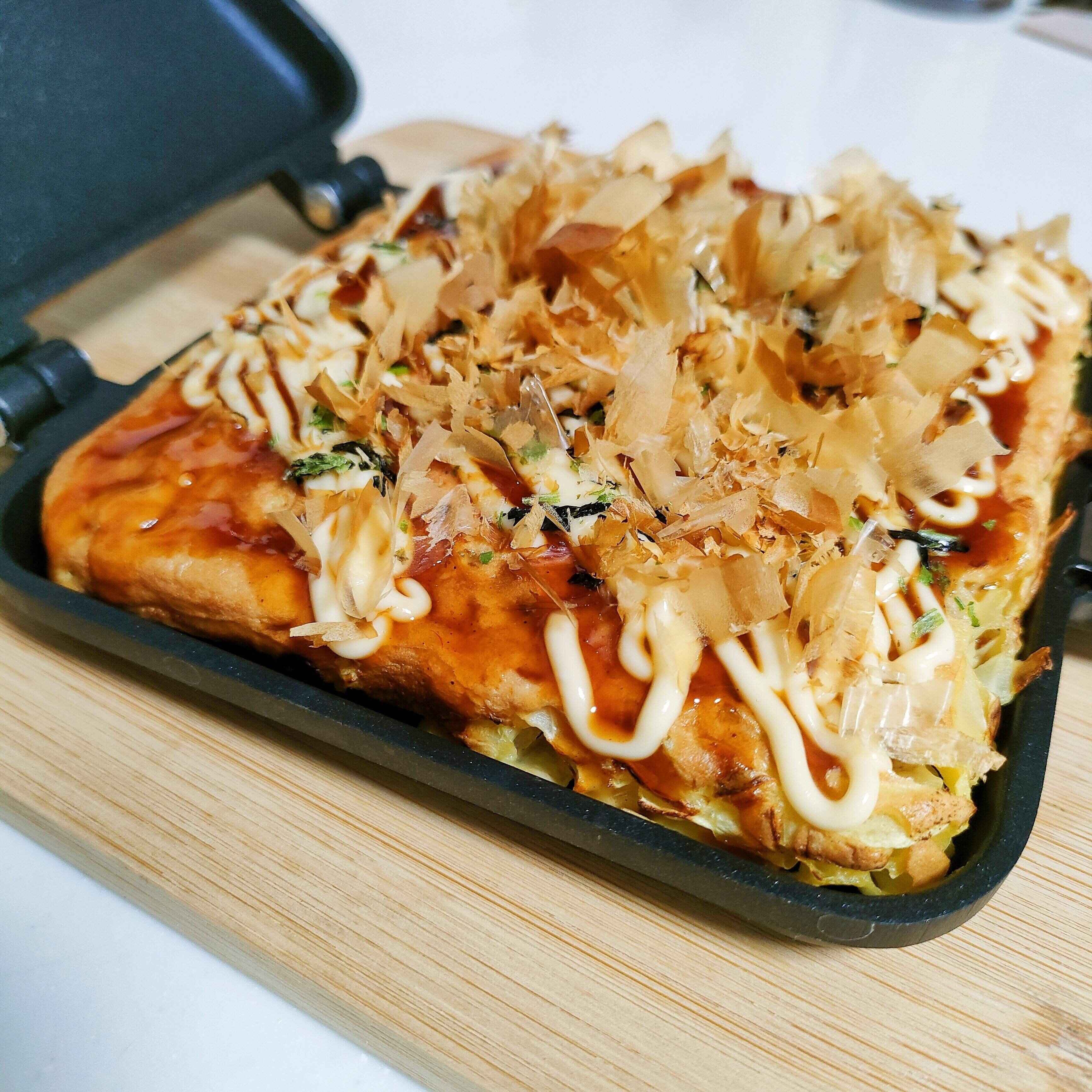 もう一つチャレンジしたレシピは「お好み焼き」です。通常のお好み焼きの生地を作り、鉄板部分にのせて焼くだけ!