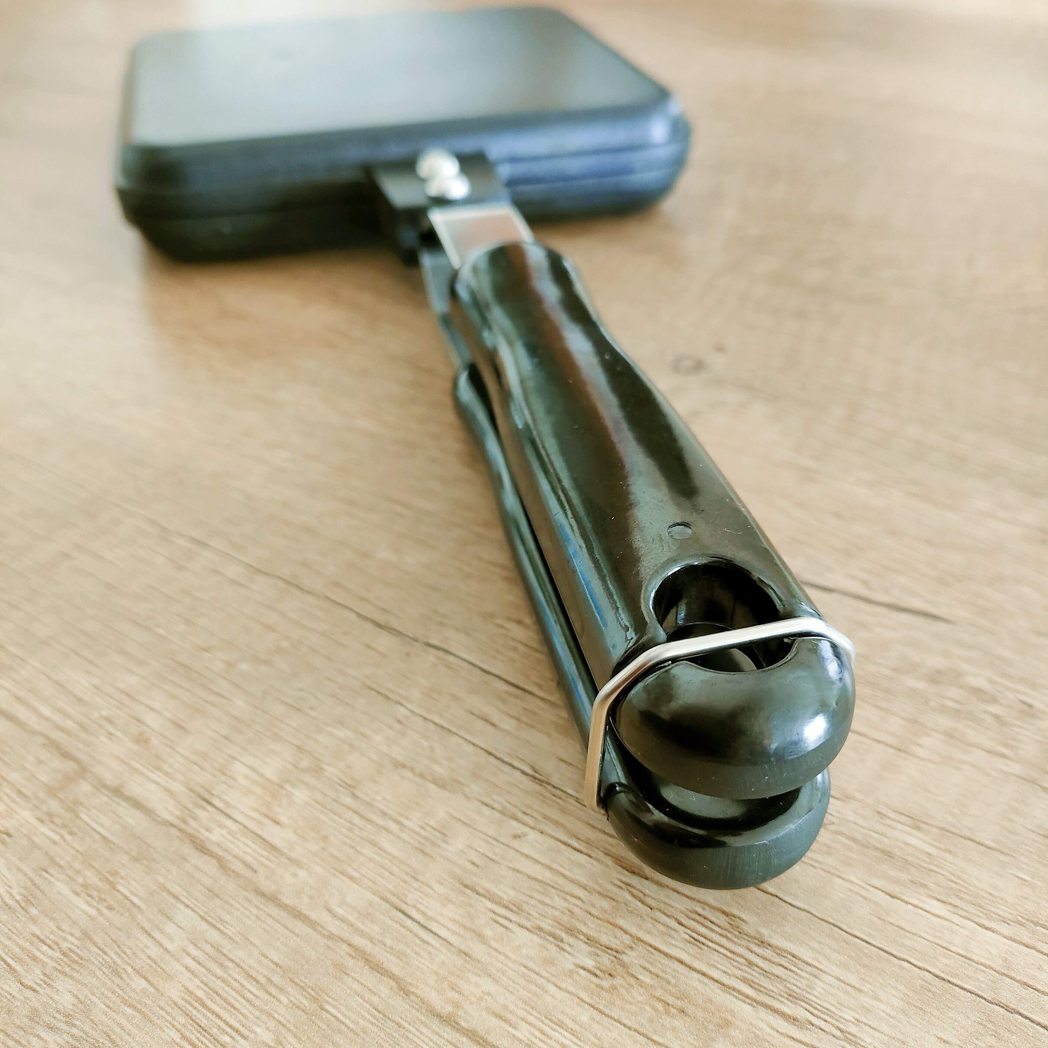 とてもシンプルな形のホットサンドメーカーで、食パンがぴったり挟まるサイズになっています(約13cm×15cm)。持ち手まで合わせると、約33cmチと少し大きめ。