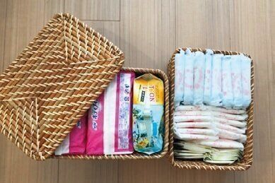 高級感のあるラタンボックスに入れれば、万が一棚を来客に見られても問題なし。サイズ違いをまとめてナプキンセットを作っておけば、生理中も快適です。