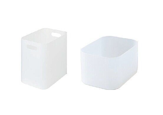 (右)「ポリプロピレンメイクボックス・1/2」(約150×220×86mm)¥190