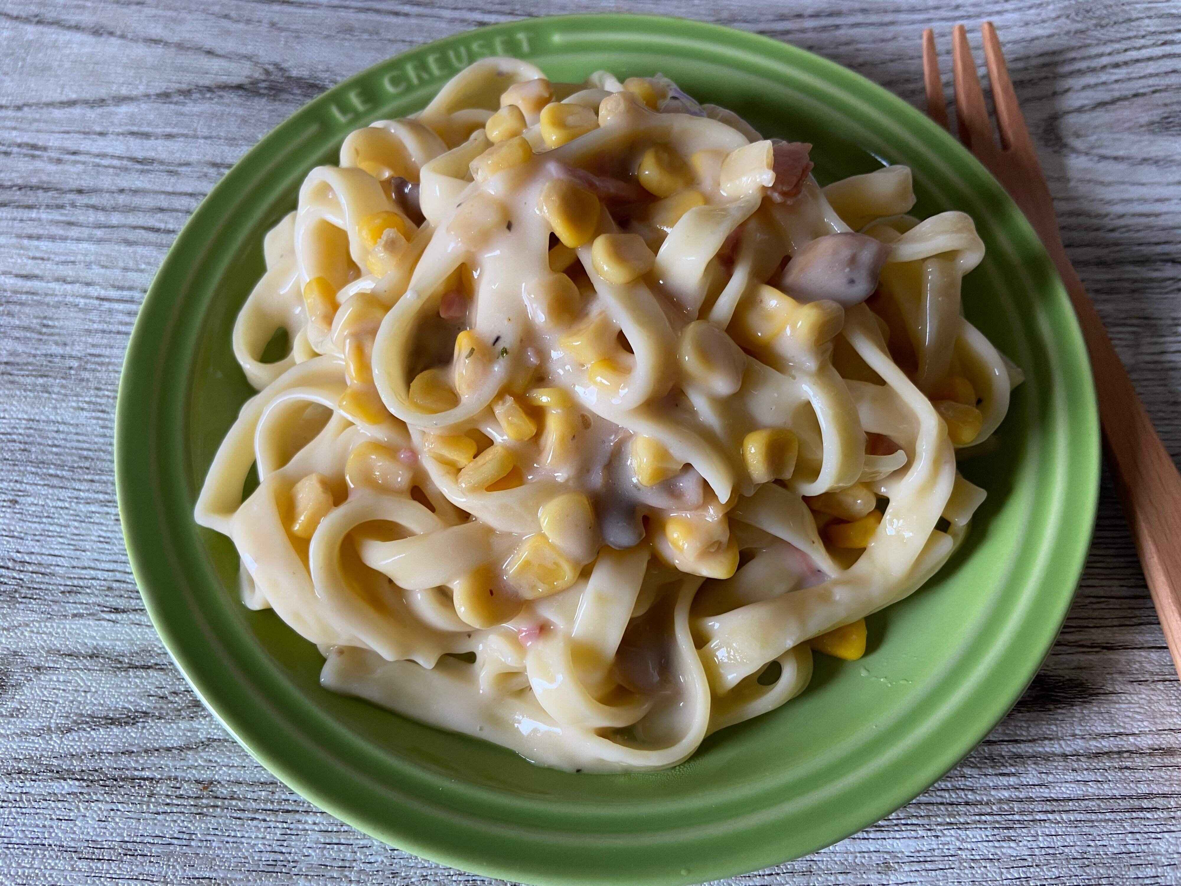つづいてはパスタの具材に。牛乳やチーズでつくったチーズクリームソースにコーンをたっぷり入れて、茹でたパスタと和えてお皿に盛りつければ濃厚なクリーム系パスタにコーンの甘みがアクセントになったランチにおすすめの一皿の完成。