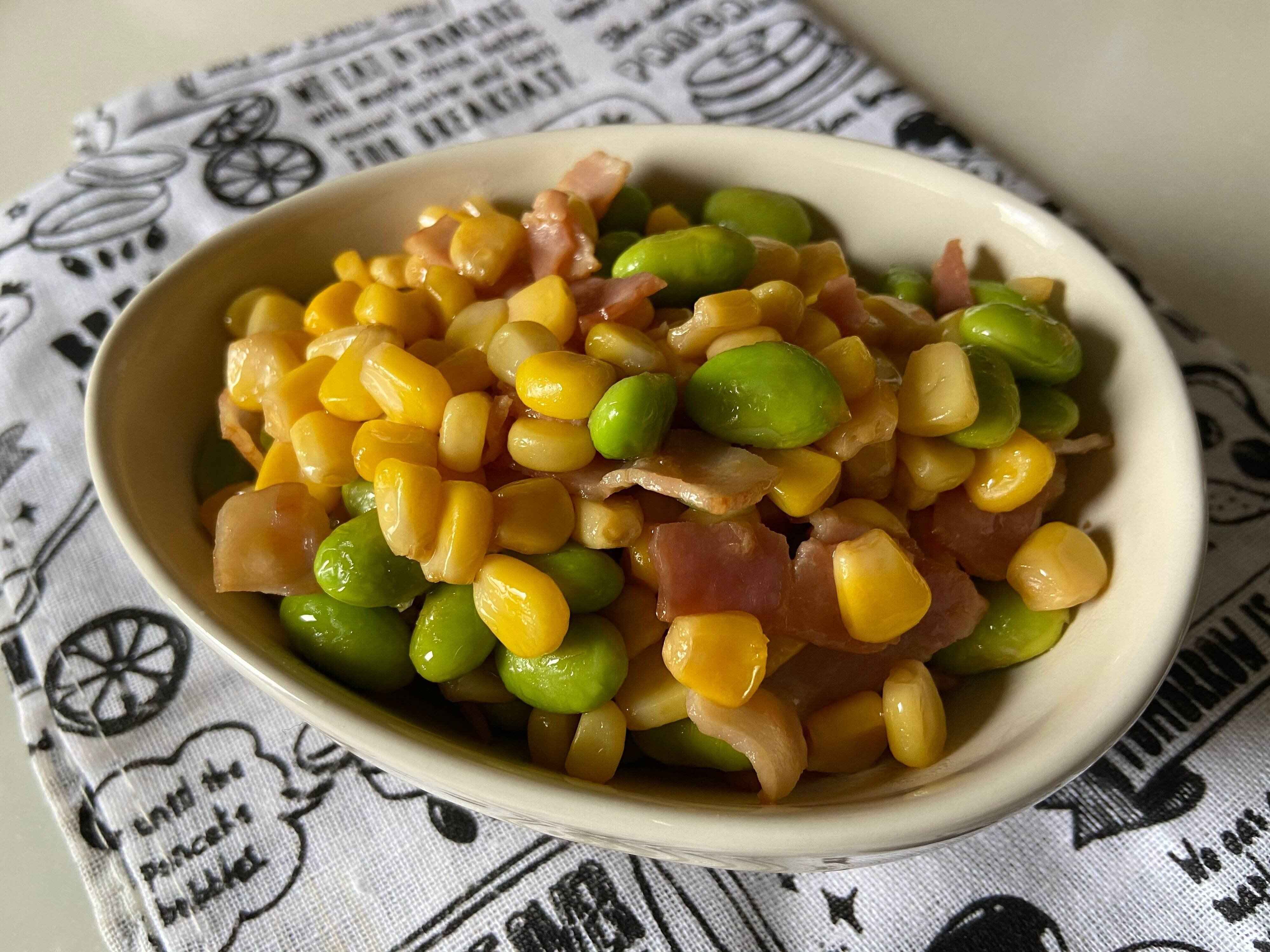 まずはとっても簡単な定番メニューのバターコーン。バターと冷凍のままのコーンをフライパンに入れて加熱し、仕上げに醤油をたらしてあっという間に完成。コーンだけでつくる時もあれば枝豆やベーコンをプラスすることも。