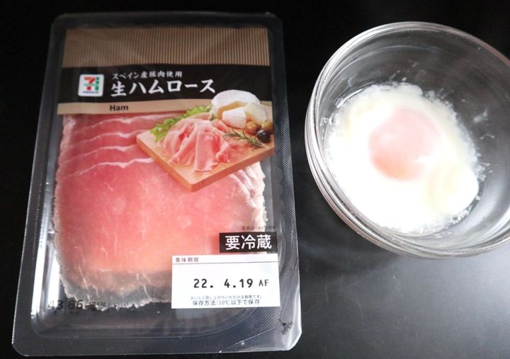 おすすめのアレンジを紹介します。使うのはセブンプレミアムの「生ハムロース」と半熟卵。
