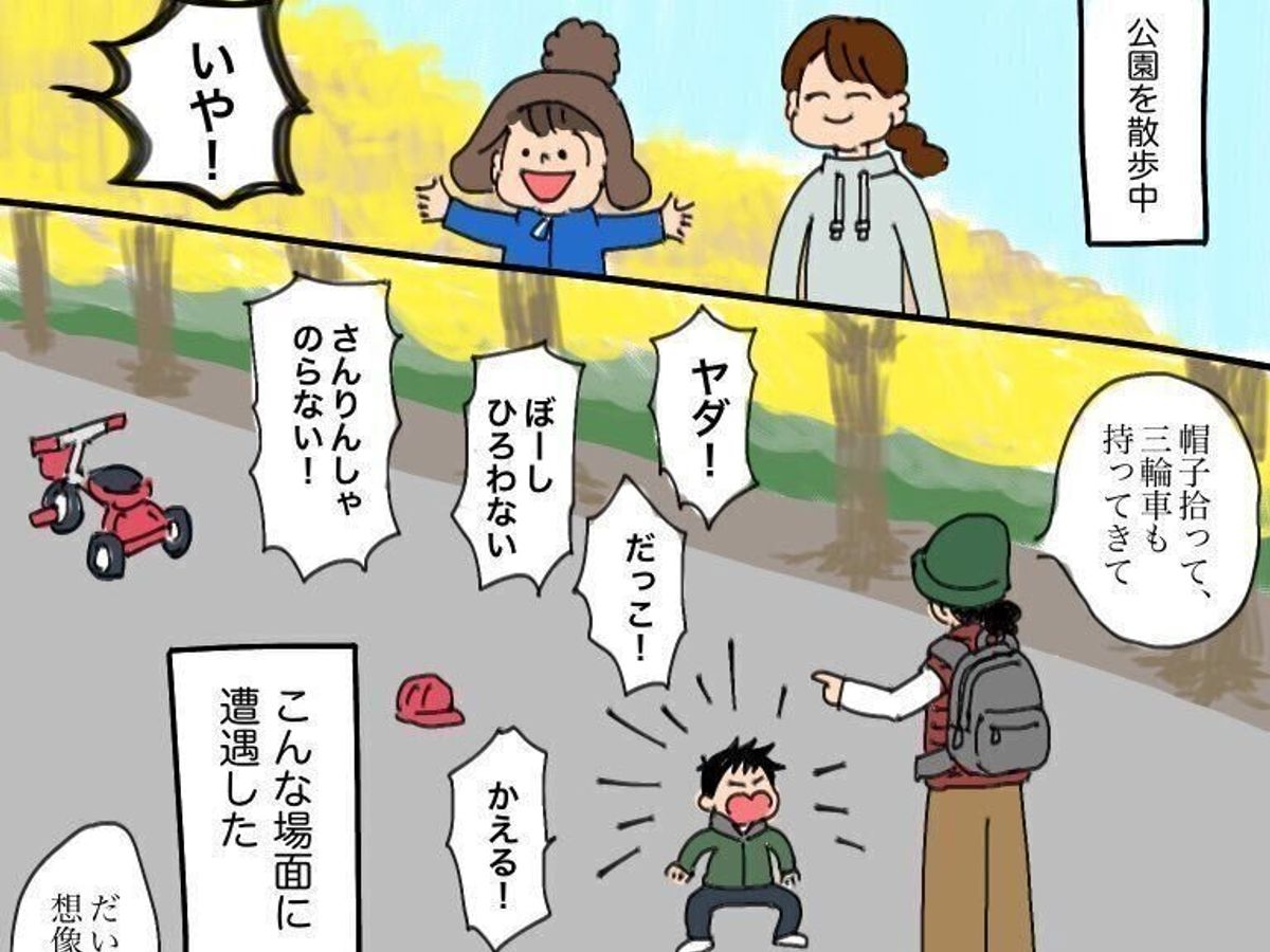 公園でイヤイヤ連発中の男の子に向かって、なぜか突然走り出す息子さん。