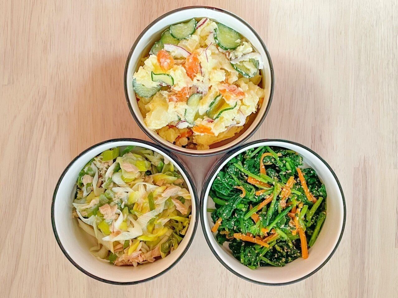 例えば、月曜日にポテトサラダをつくったら、火曜日はほうれん草のごま和えをつくり、水曜日は長ねぎのナムルをつくる…。この積み重ねで、副菜3品ほどが常に冷蔵庫にある状態に。