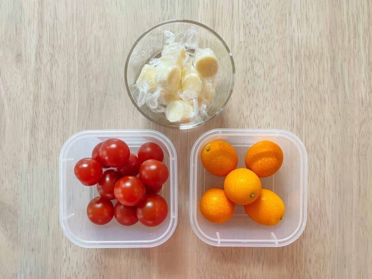 野菜はミニトマト、果物は今の時期ならいちごやきんかん、たんぱく質はキャンディーチーズなどがおすすめ。手を汚さずに食べられるものを選ぶのもポイントです。
