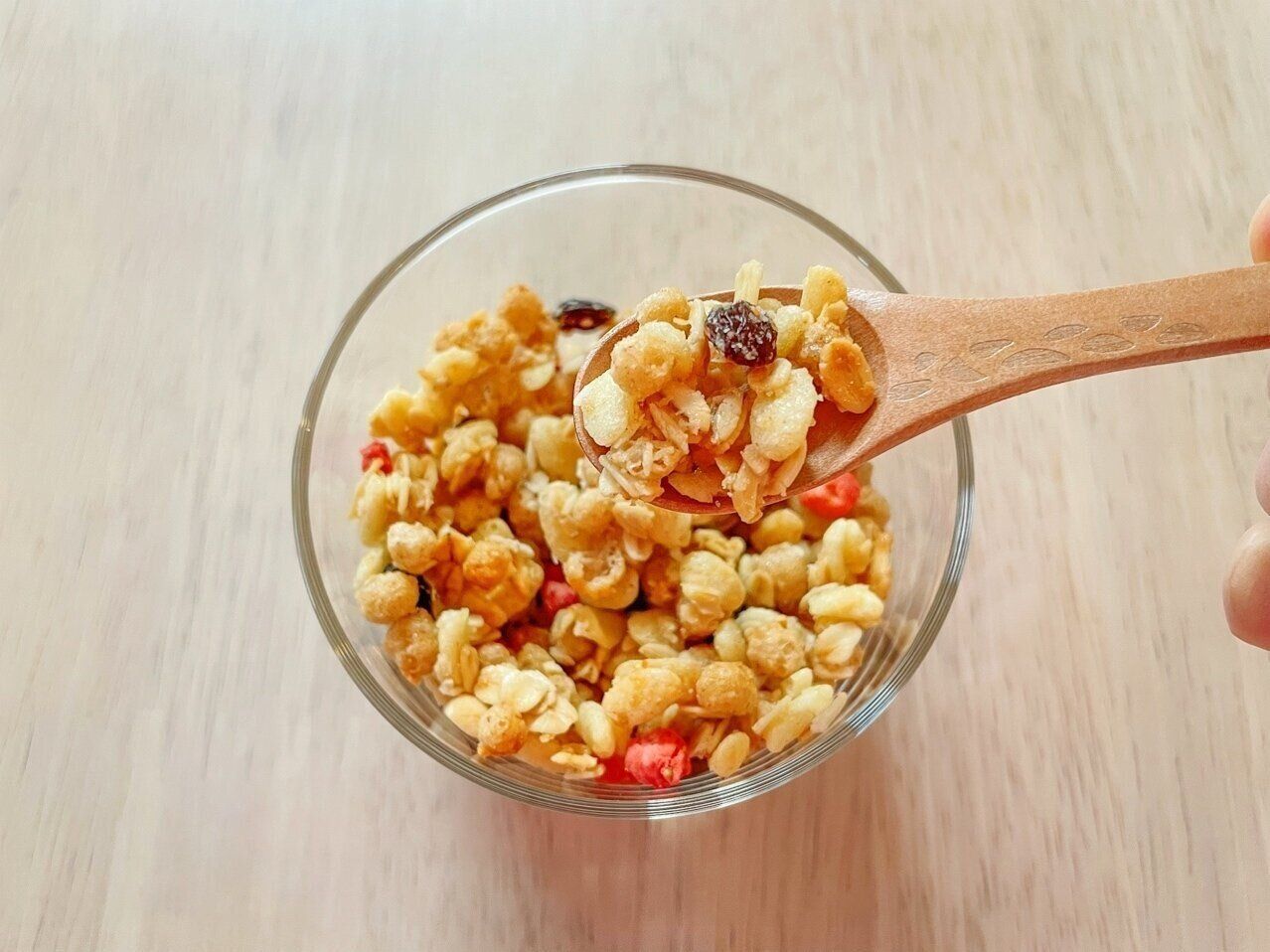ドライフルーツがミックスされているグラノーラに牛乳やヨーグルトをかければ、炭水化物・ビタミン・たんぱく質が摂れるので、よく取り入れています。