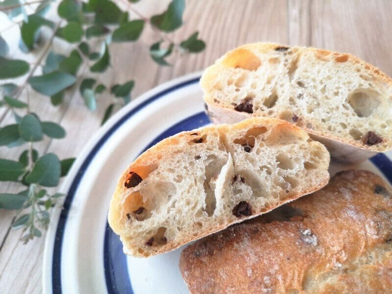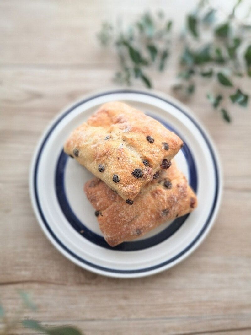 チョコチップの甘さと、クランベリーのキュンとした酸味がとにかく最高の組み合わせで、固めのパンが噛みしめるほどにおいしくて、さらにクリームチーズをトッピングすると止まらないおいしさ!