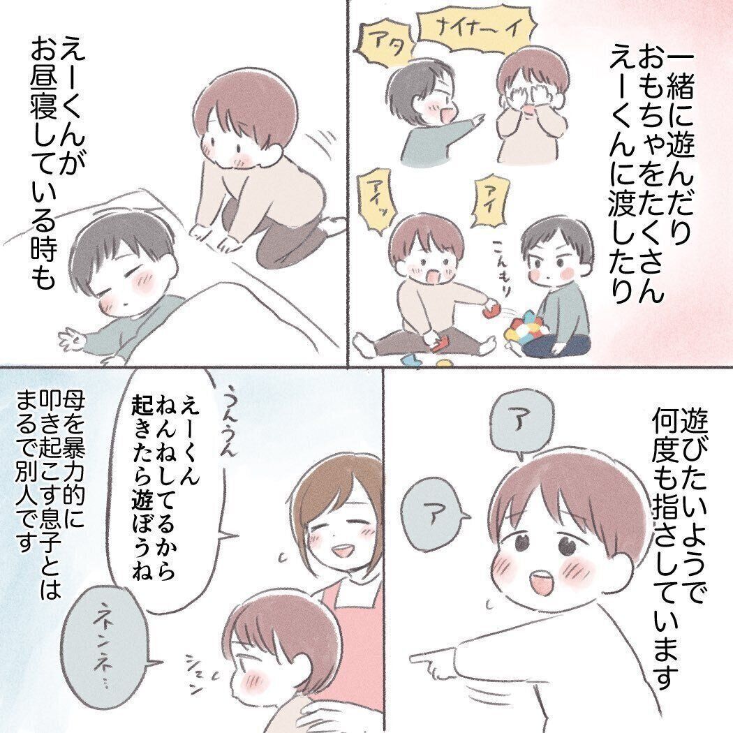 漫画に描かれている、つばめくんが一生懸命おもちゃを渡している姿にキュンとしますが、ほかにもえーくんへの愛情表現があるそうで……。
