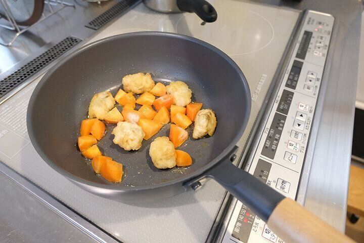 そして、深型のフライパンにもすばらしいところがあります。これはなんと言っても、鍋の役割も果たす…!というところに尽きると思います。大きめな鍋を持っていなくてもこれさえあればパスタも茹でられます…!汁物もつくれます。わが家では大いに重宝しています。本当におすすめです!