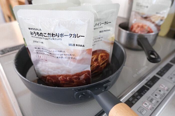 また深型なので、お鍋として使うこともできます。たくさんのお湯を入れて湯せんをすることも可能!今回はレトルト5パックを一気に!!そんな使い方もできて大変便利です。普通にカレーやシチューもつくれちゃうサイズですね。調理器具をあんまり増やしたくない、そういう方にはぜひ、選んでもらいたいです!無印良品の「セラミックコート深型フライパン」、ぜひお試しくださいませ!