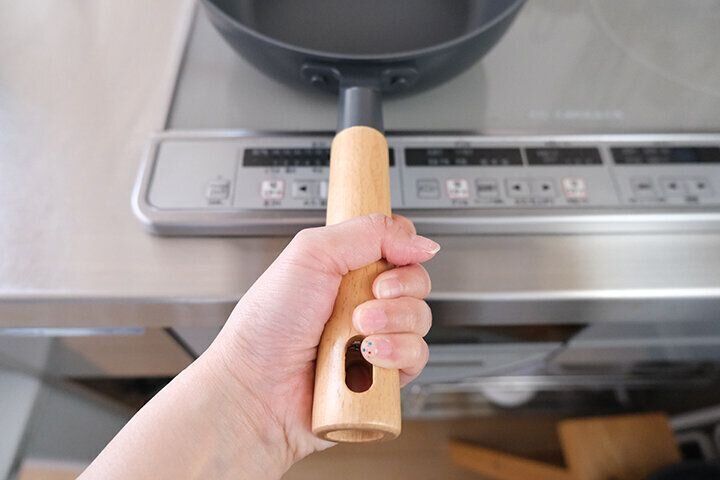 取っ手には天然木(ブナ材)が使われており、手馴染みがとってもよいです。持ち手の形状も男女ともに掴みやすく、よく考えられているな〜と感心いたしました。ちなみに通し穴も空いているので、吊って収納することもできます。