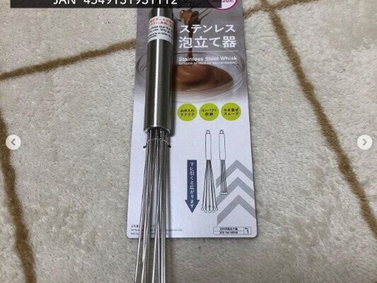 泡だて器は複雑な形で、洗うのが大変なアイテムのひとつ。こちらの「ステンレス泡だて器」220円は、シンプルな形でお手入れがしやすいと人気です。下に引くと広がる構造で、使わない時には元に戻しておけば、コンパクトで収納もしやすいですよ。