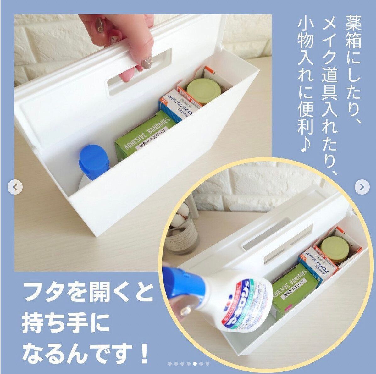 一見するとふつうのフタつき収納ボックス。この商品のすごいところは、背面どうしで2個合体ができること!さらに合体した状態でフタ部分を開くと、フタが持ち手に変身します。サイズも4種類あり、用途に応じて選べます。写真は一番大きいサイズです。