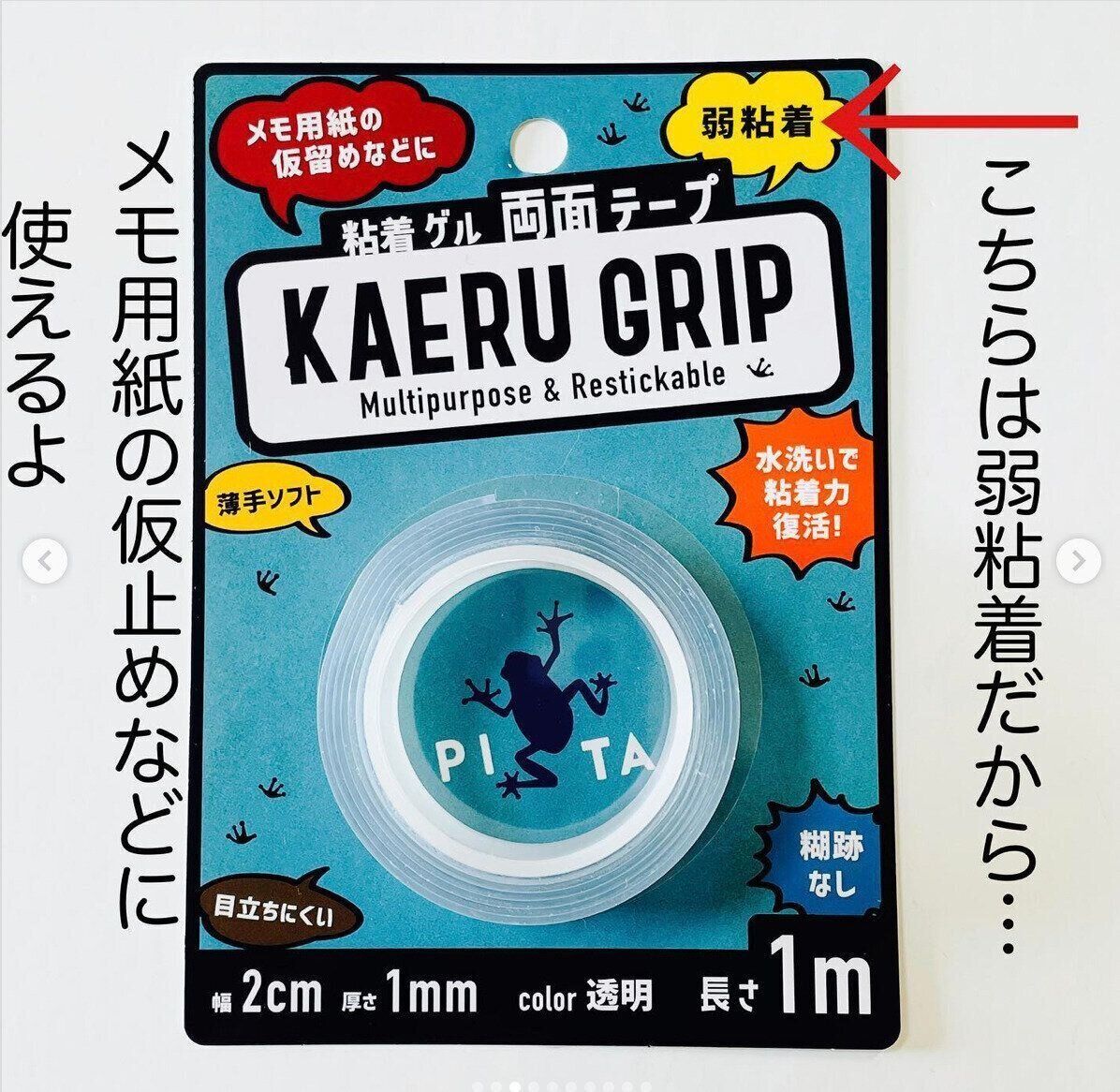 一時期流行った「ヤモリグリップ」ご存じでしょうか?剥がせる両面粘着ゲルテープで、「ヤモリ」は厚手で強粘着タイプ。その仲間として登場したのがこの「カエルグリップ」です。こちらは薄手で弱粘着タイプ。メモ用紙の仮止めなどにぴったりです。どちらも糊跡が残らず、水洗いで粘着力が復活します。安くてなかなか使える商品です。