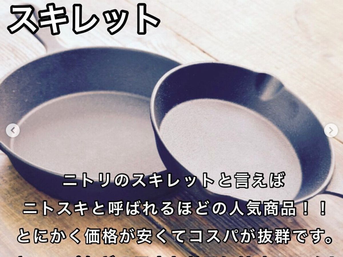 通称「ニトスキ」。キッチンでもアウトドアでも使いたい、ニトリのスキレットです。なんと価格は299円!直火もIHも使用可能です。使い始めには、シーズニングと呼ばれるスキレットに油を馴染ませる下準備をするのがポイントです。