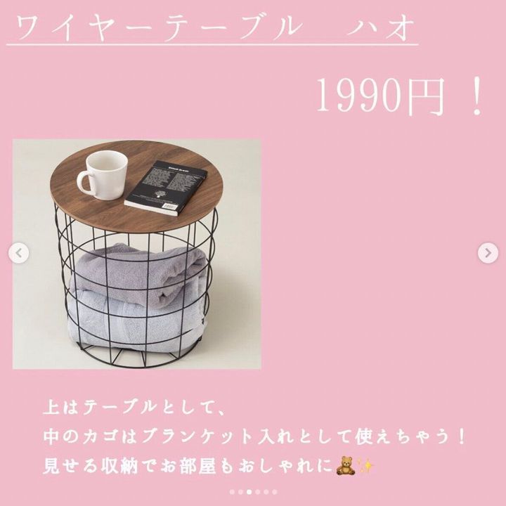 寝室やリビングでサイドテーブルとして使いたいワイヤーテーブルです。ワイヤー部分にはブランケットを入れたり、雑誌を入れたりしてもいいですね。ざっくり投げ込むだけで絵になります。価格も1,990円とお手頃!すぐにでも取り入れてみたいアイテムです。