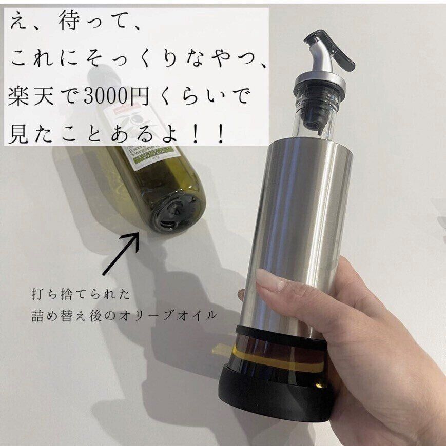 ご家庭でオイルボトルは導入していますか?先ほどの木製のまな板同様、金額もお高め、正直詰め替えなくても特に問題はないもの…ではありますが、【キャンドゥ】でなら550円でお買い求めいただけるうえ、詰め替えるメリット満載です。まず、液だれがしにくくなりますし外側がステンレスなので直射日光からオイルを守ってくれます。更には底がゴムなので滑りにくく転倒防止になります。スタイリッシュな見た目なのでキッチンに出しておいても邪魔になりません。まだオイルボトルを導入していないご家庭はぜひ試してみてください。