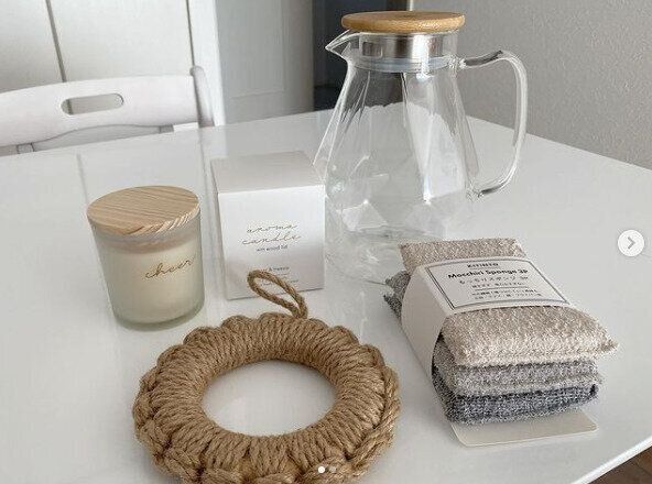 スポンジやキャンドル、鍋敷き、ガラスのピッチャーなど、こちらはすべて3COINSでそろえることが可能です。どれもシンプルでおしゃれ、かわいいキッチン用品ですね。
