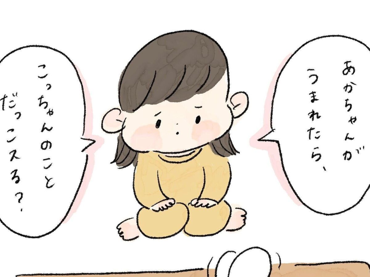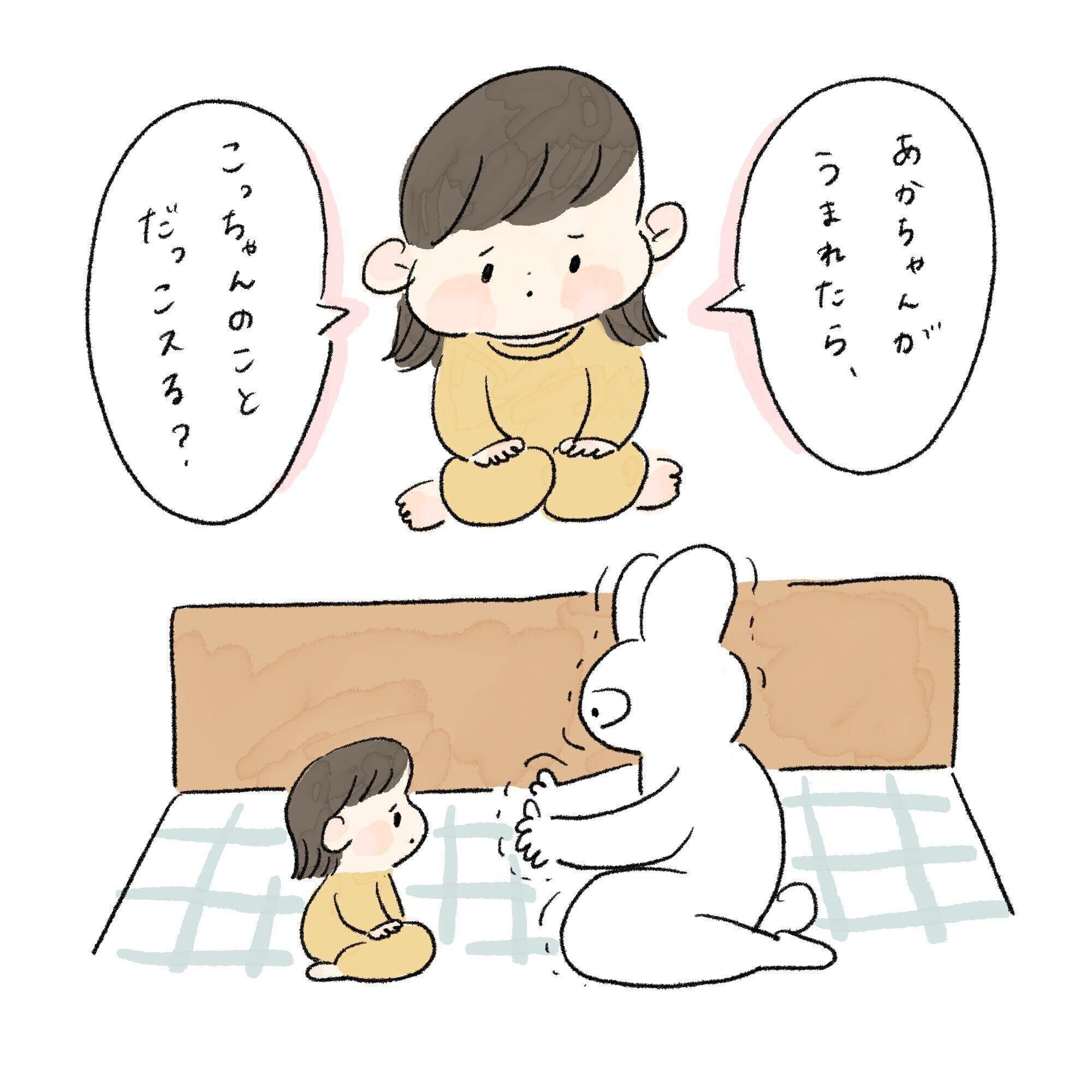 おのりさんは2人目を妊娠中。そんなとき「あかちゃんがうまれたら、だっこスる?」と、こっちゃんに尋ねられるのです。