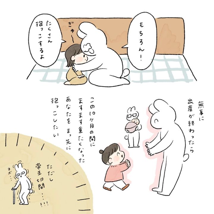 「ありがとうございます!帝王切開だったので帰宅して、しばらくしてから抱っこしました。 約1年ぶりの抱っこだったので、娘がどのくらい重くなったのかドキドキしながら抱っこしました。しっかり重くなっていて、成長した娘を愛おしく感じました」