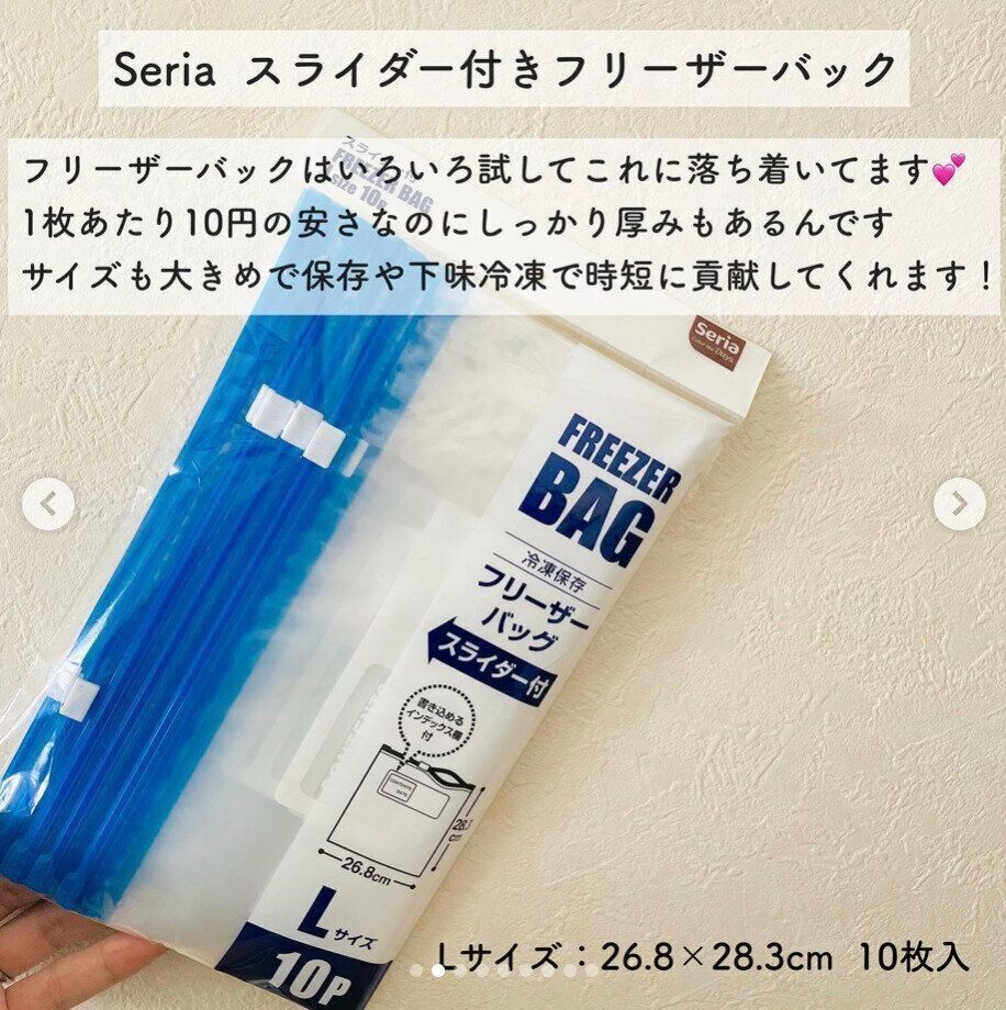 らむさんが「いろいろ試してこれに落ち着いた」という、セリアのスライダーつきフリーザーバッグ。Lサイズは10枚入りなので1枚10円という安さ!厚みがあると破れの心配も少なく、安心して使えますね。確かにヘビロテしたいアイテムです!
