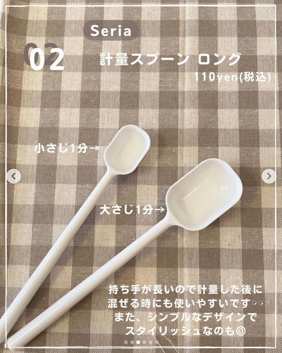 料理に欠かせない計量スプーンも、セリアだとこんなにおしゃれに!シンプルでスタイリッシュなデザイン、キッチンに出しっぱなしにしても映えますね。ロングの名前のとおり持ち手が長いので、計量してそのまま混ぜるのにも使えちゃいます。食洗機対応なのもうれしいポイントです。