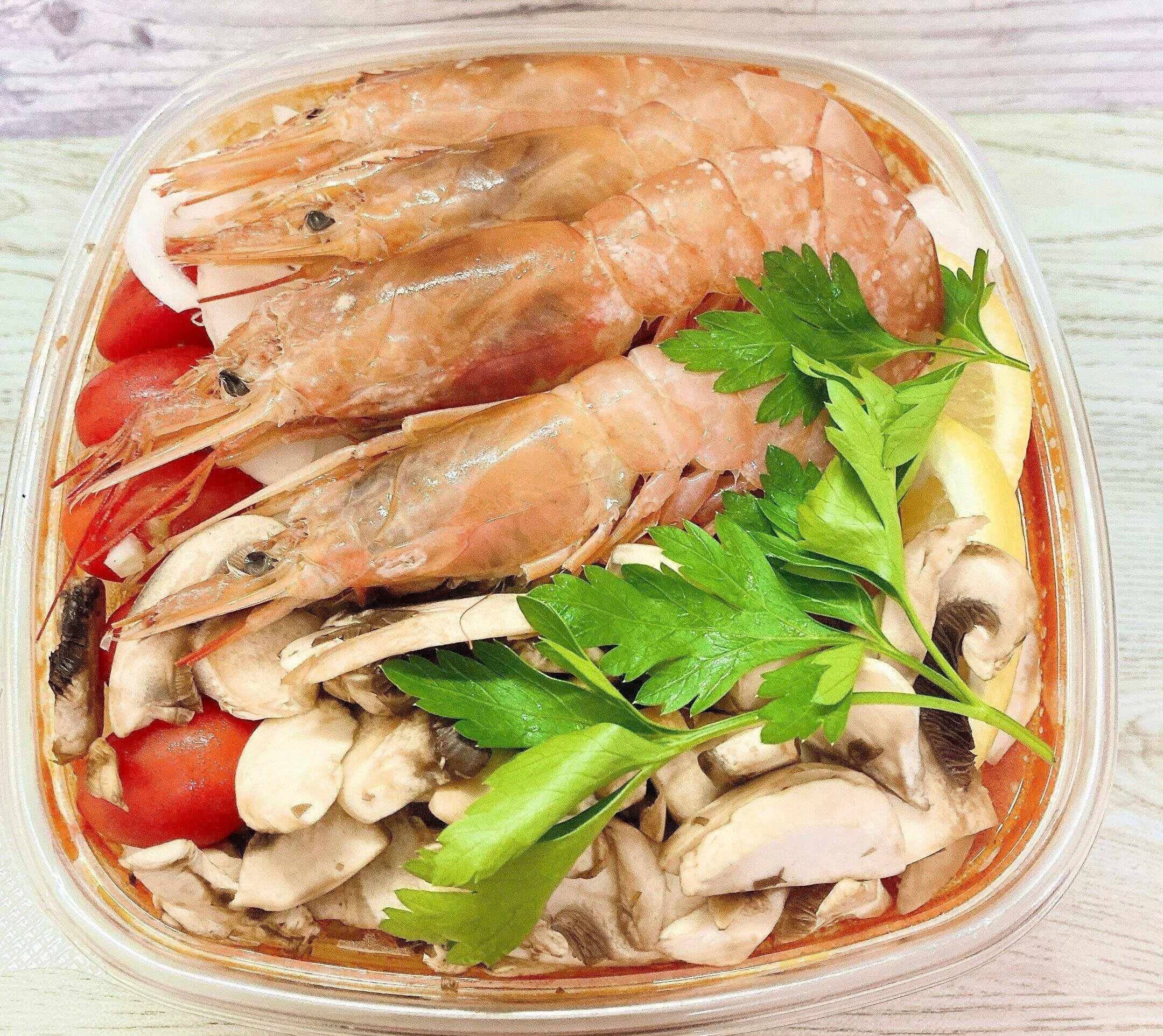 表面に見えていた海老の他にもスープの中に、イカ、あさり、タラ、ムール貝と魚介類がゴロゴロとたくさん入っていました。表面に見える具材もセロリ、マッシュルーム、玉ねぎ、ミニトマトと野菜もたっぷり入っていました。