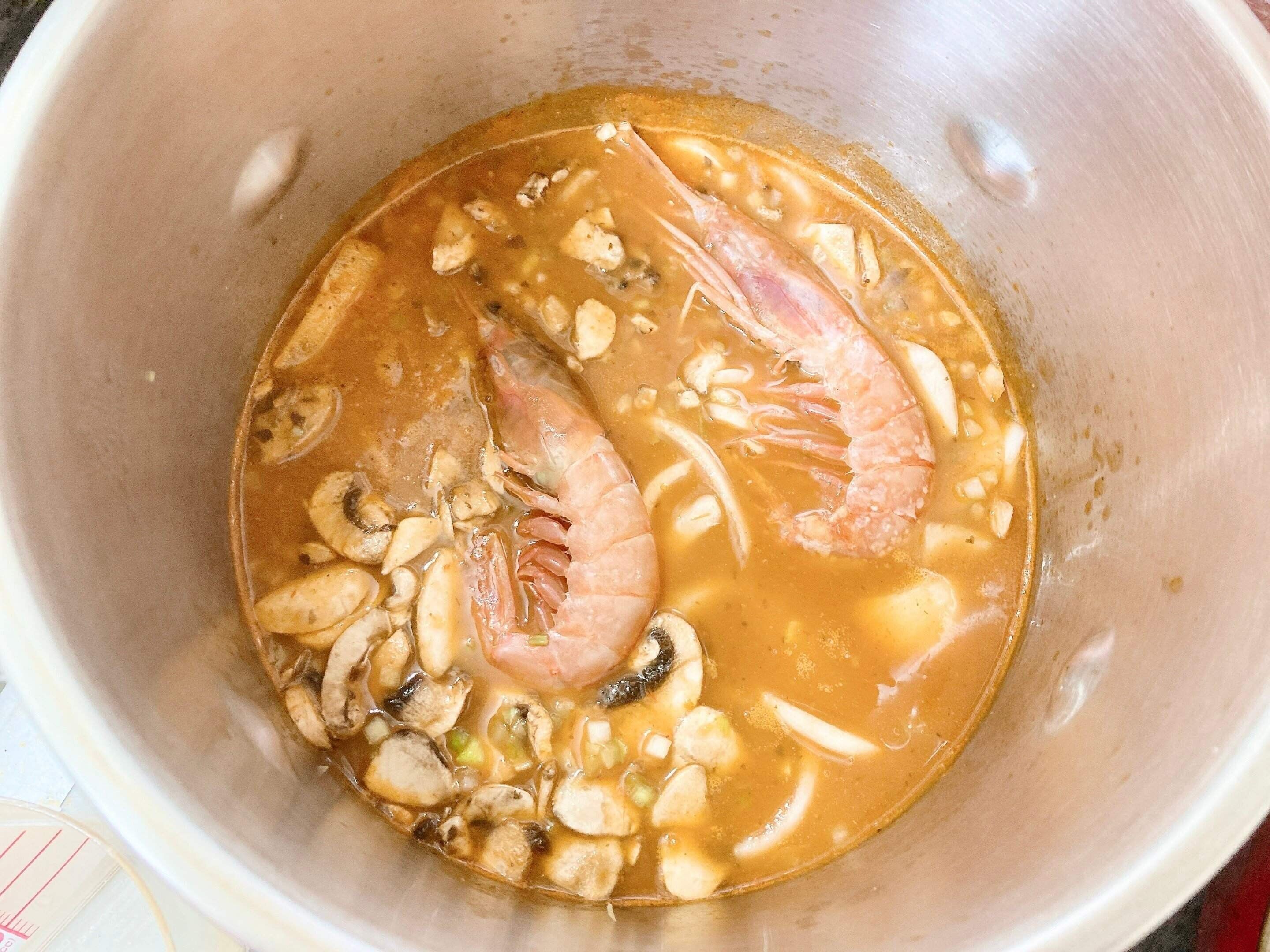 スープが沸騰したら弱火にし海老をしずめて蓋をし再度、沸騰するまで煮込むと海老が縮みすぎず身がやわらかく縮まずに仕上がります。