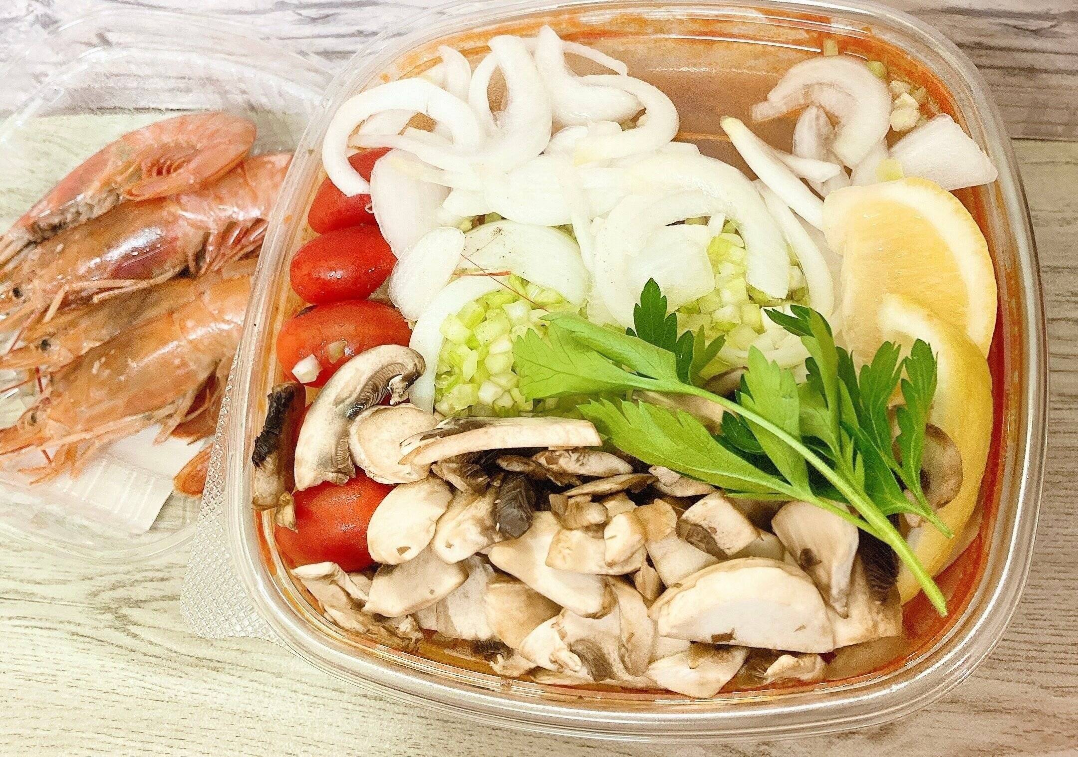 チョッピーノスープの容器は特殊で外蓋を開けると具材が入った受け皿とその下にたっぷりのスープが入った深い容器になっていました。