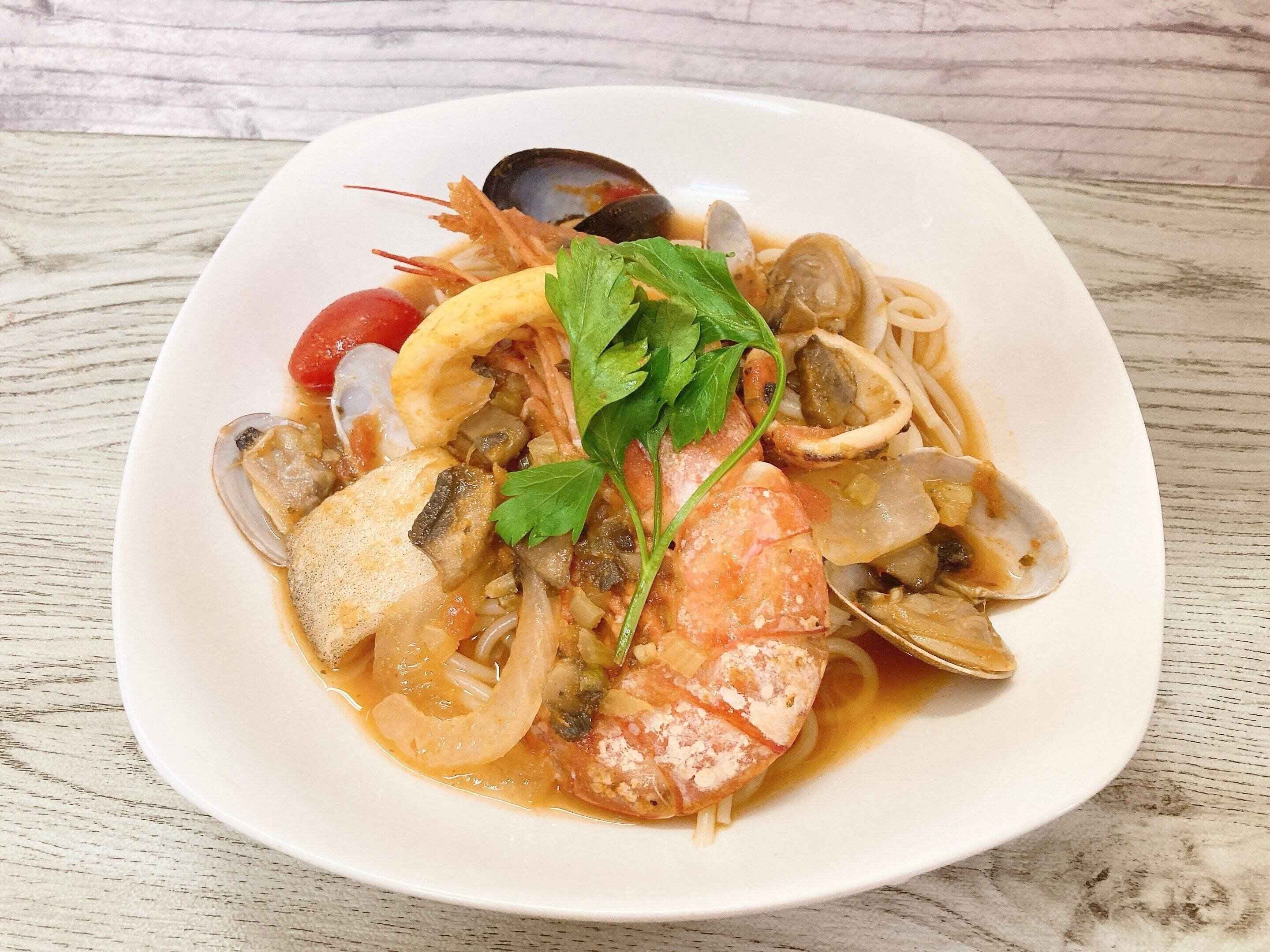 味はピリ辛のペスカトーレのような魚介類のうま味がパスタにしっかり絡んだ濃厚な味わい。深めのお皿でスープをしっかりかけてスープパスタのように食べるのがおすすめ。