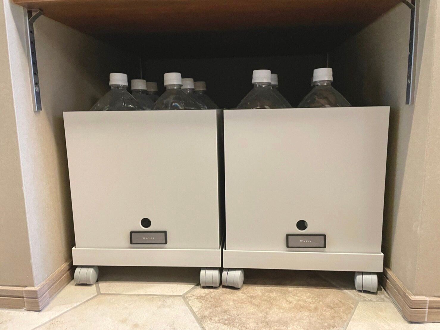 「下エリア」は、かがんだり目線をおろさないと見えにくいため、使用頻度が低いものをストックしましょう。また、使用頻度が高いけれど重いモノは棚の低い位置にキャスターつきのボックスや小型台車などを上手く活用して、引き出せるようにすると使いやすくなります。キャスターつきの収納方法は、重さのあるお米や飲料ストック調味料ストックなどにおすすめです。