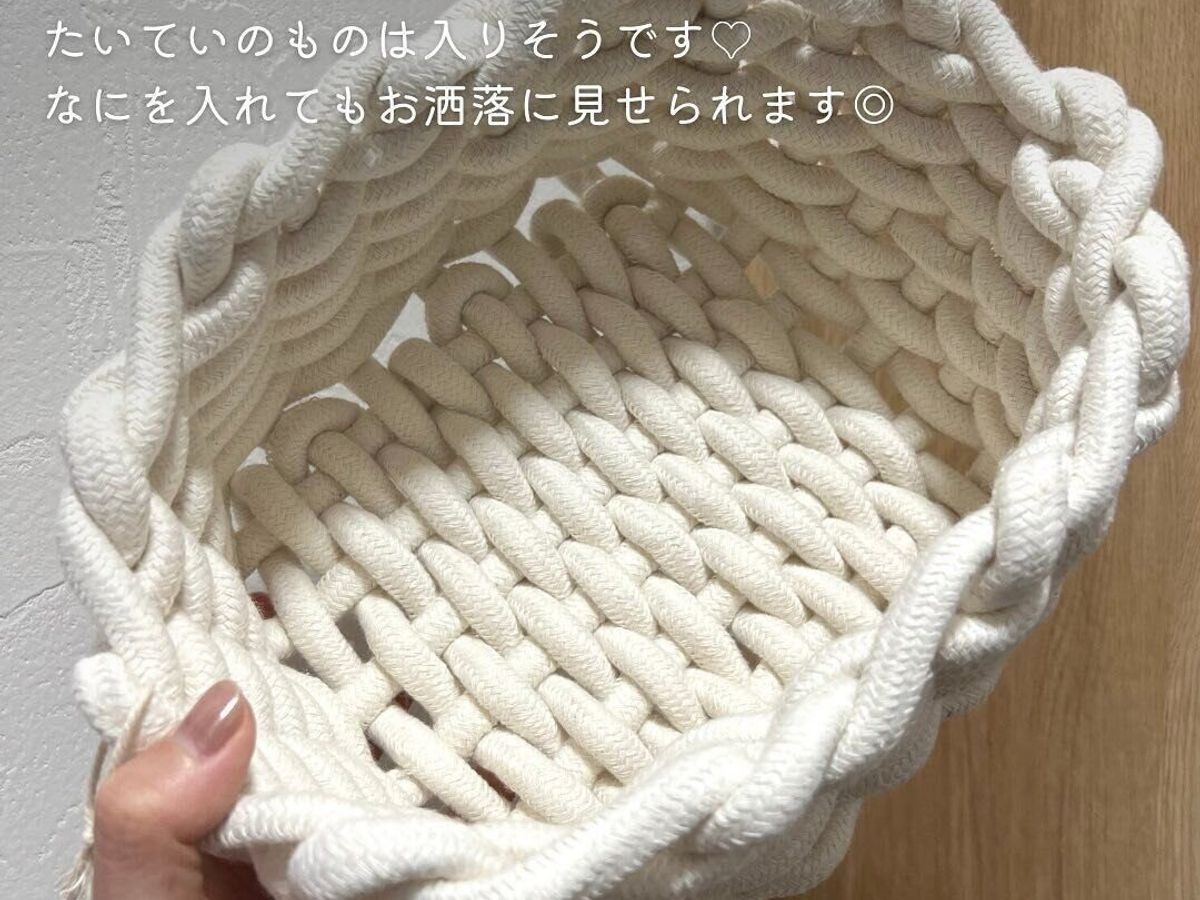 ざっくりとロープ編みされた白いバスケットは、部屋に置いているだけでおしゃれ度がアップするかわいいアイテム。見た目がかわいいだけじゃなくて、大きさも深さもあるので使い勝手もいいんです。