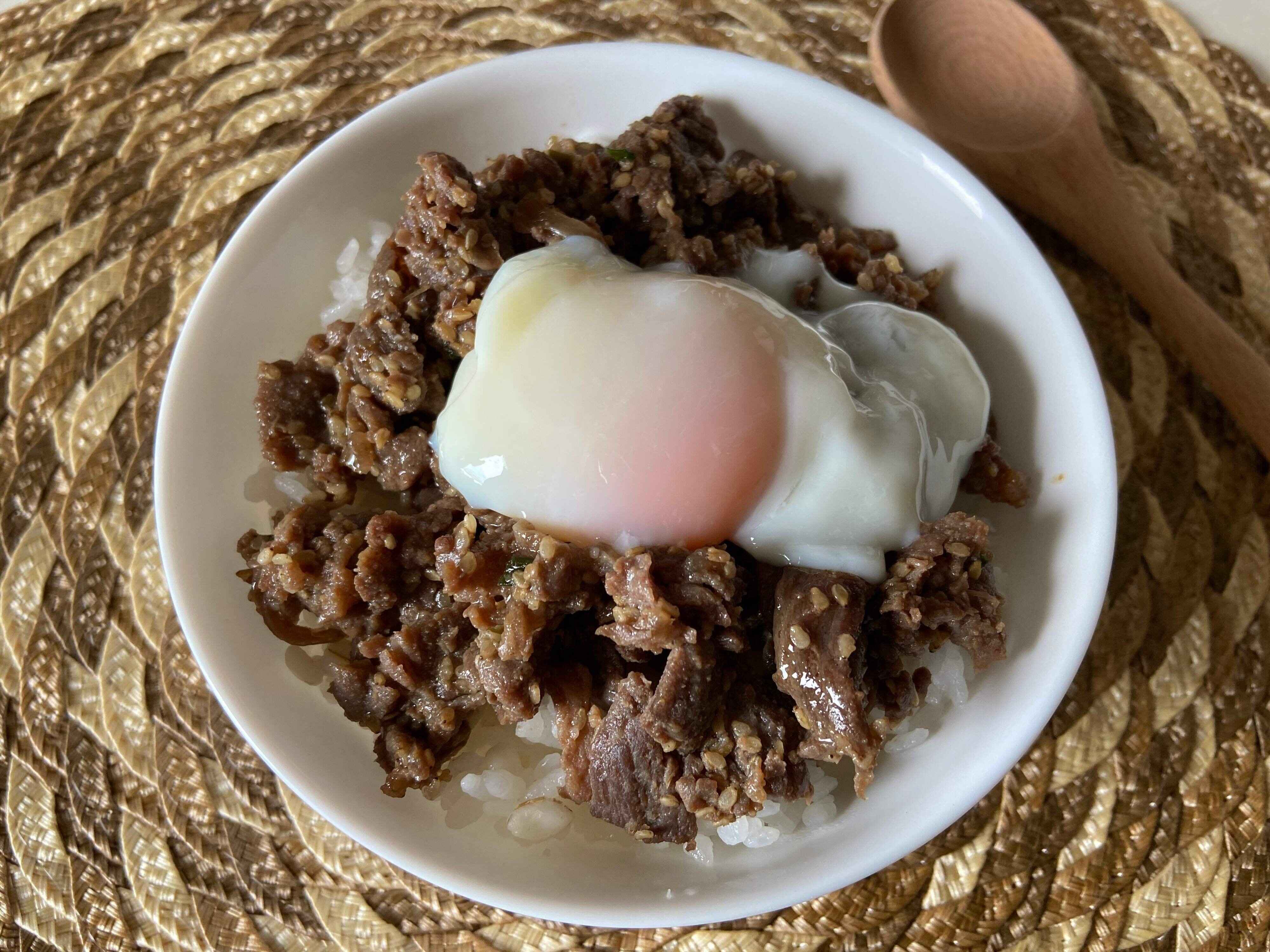 つづいても簡単ボリュームのある一品、週末のランチなどにうれしい丼アレンジです。フライパンにプルコギビーフを炒めて火が通ったら、ご飯の上にたっぷりのせて卵をトッピング。時短調理でおいしいプルコギ丼の完成!柔らかいお肉と甘辛い味付けで白いご飯が、がっつり進みます。卵を崩しながら食べれば、黄身が絡んでまろやかな味わいに!筆者の子どもたちに大好評のスタミナ満点メニューです。