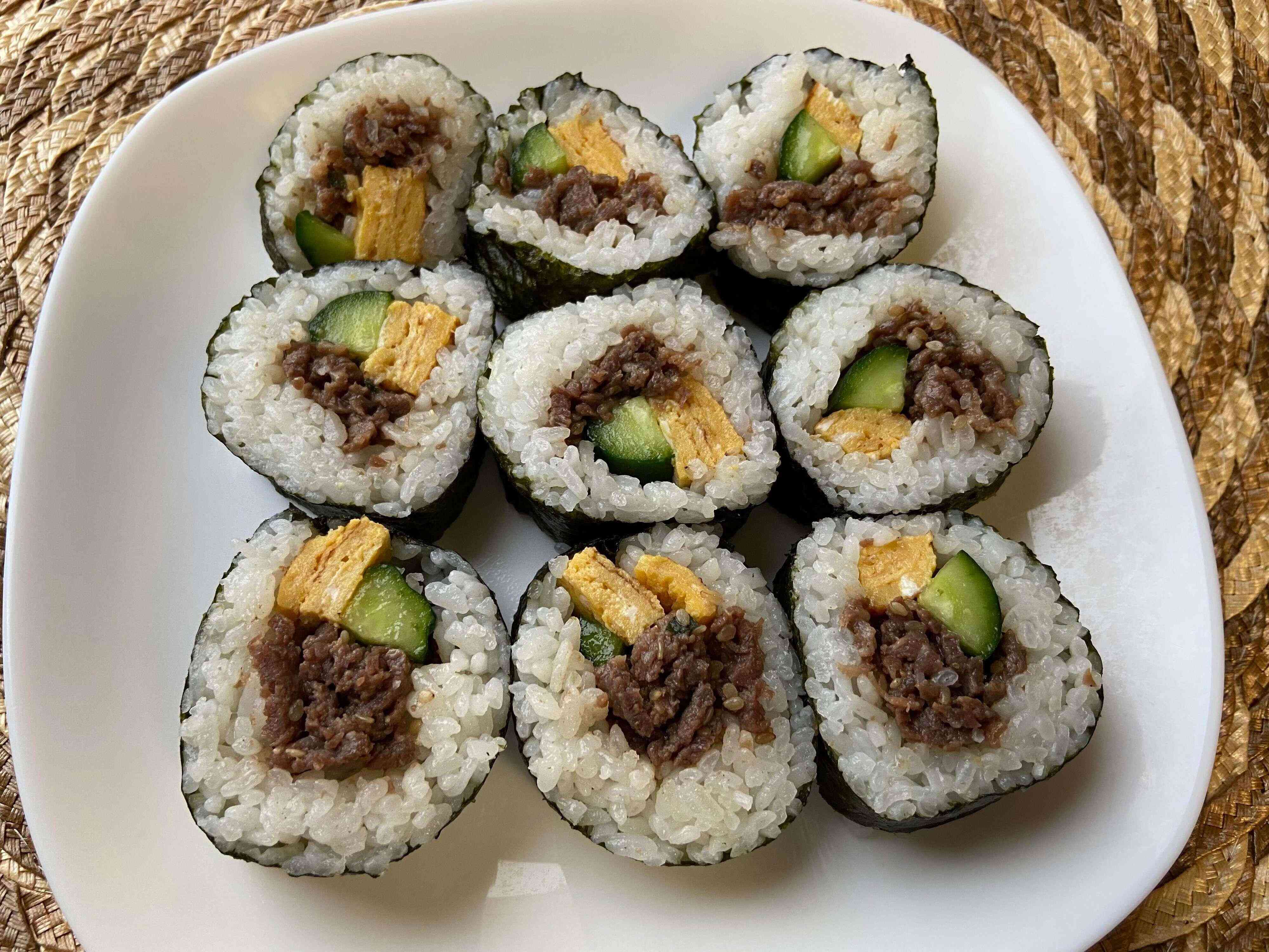 コストコユーザーの間でも人気のプルコギアレンジは韓国風海苔巻きのキンパです。筆者は出し巻き卵ときゅうりを合わせて作るのがお気に入りで、見栄えもするので記念日やイベント時にも重宝する一品。出し巻き卵のやさしい味わいとシャキッとした瑞々しいきゅうり、甘辛テイストのプルコギビーフに海苔とご飯、それぞれが見事にマッチして我が家ではたくさん作っても飛ぶようになくなってしまう大人気メニューです。お好みでキムチやナムルなどを入れるとより韓国風の味わいを楽しめます。