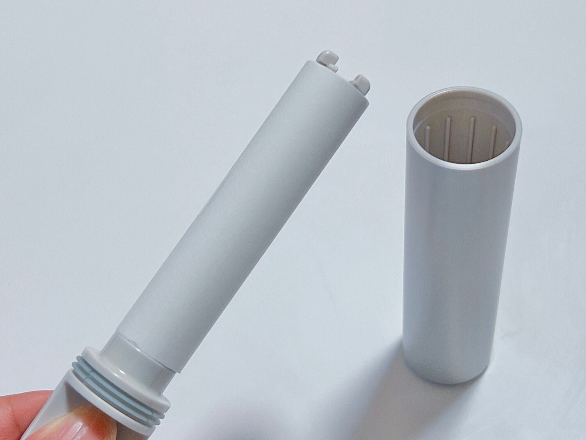 ケースを外すと中にはとても小さなコロコロ(粘着式クリーナー)が出てきます。写真だとわかりづらいかもしれませんが、スティック状の部分が粘着テープになっている仕組み。