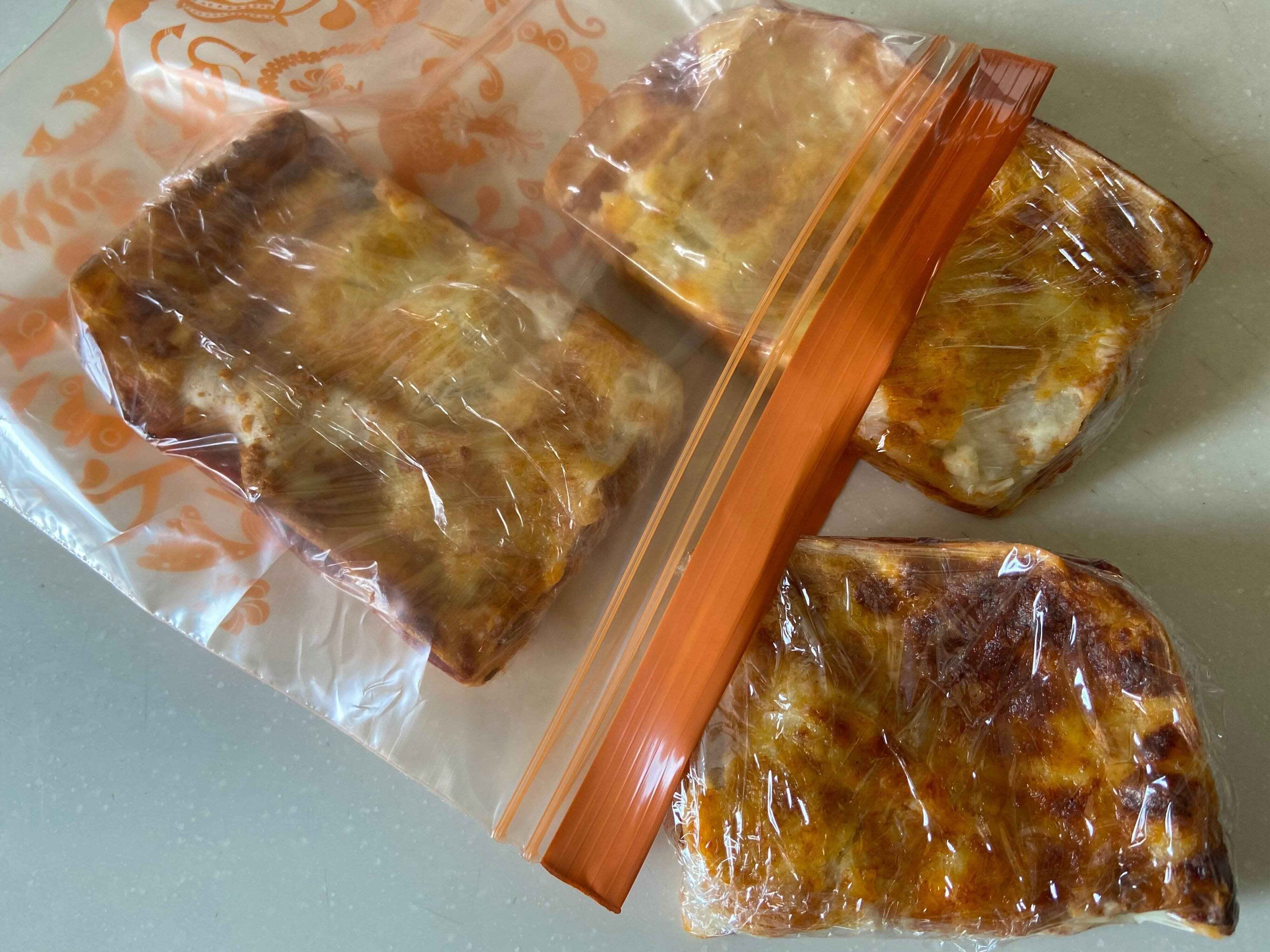 コストコのビーフラザニアは冷凍で販売されているので開封前は冷凍保存です。冷凍庫のスペースをとるので、購入前はスペースに余裕をもっておくと良いでしょう。1パックが1kgと大容量で筆者は5人家族なので一度に食べきれますが、食べきれない!という方は小分け冷凍保存がおすすめ。焼く前に半解凍にしてカットしやすくし、小分けにカットして冷凍しておくと食べたい分だけを焼いて食べることができるので便利です。筆者は1kgパックを全て焼いてから、小分けにカットしてラップをし保存袋に入れて冷凍保存しています。食べる時はレンジで500W3~4分温めるだけですぐに食べられるのでこちらもおすすめ。