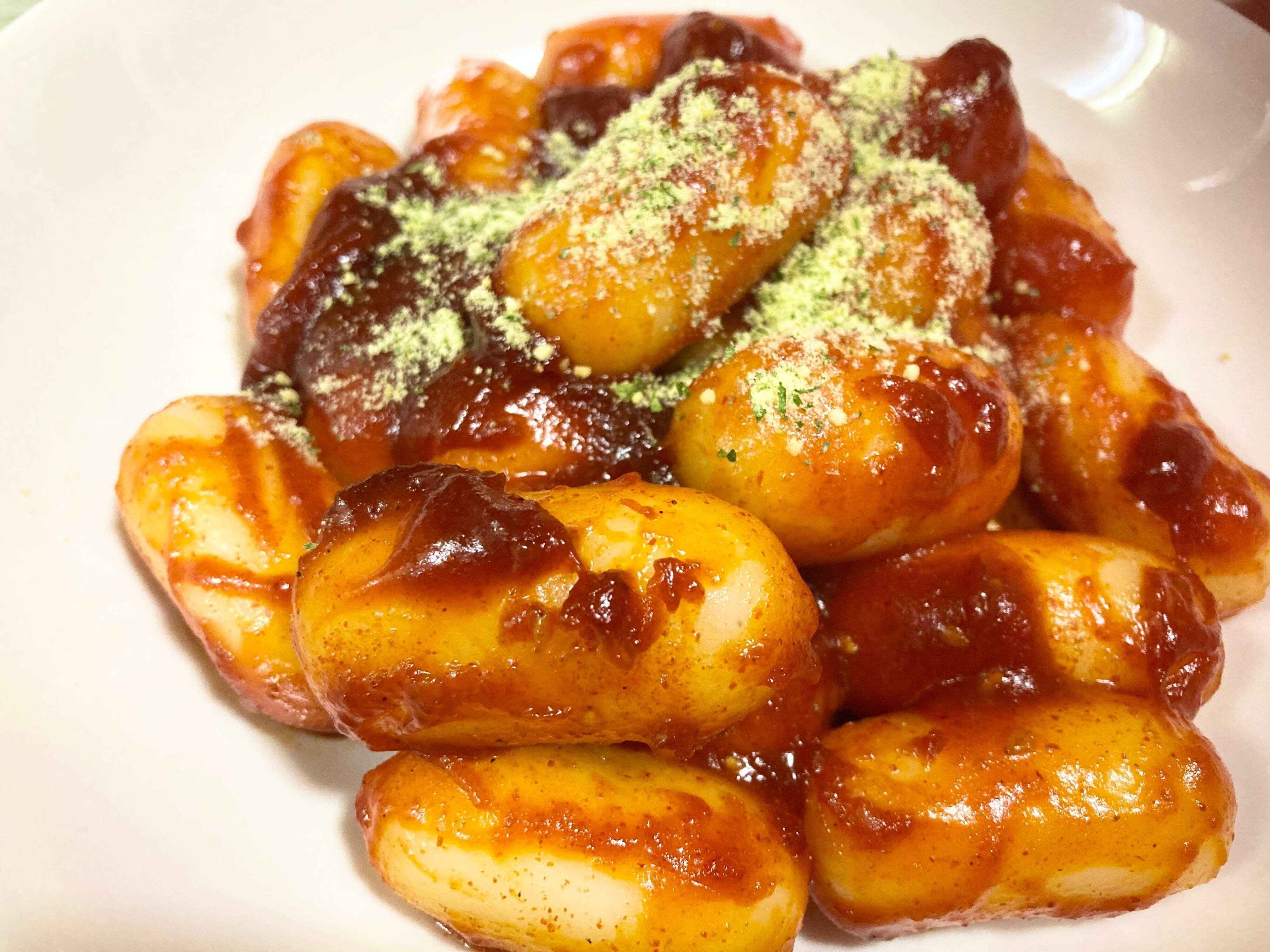 揚がったチーズトッポギにトッピングをかけて完成!