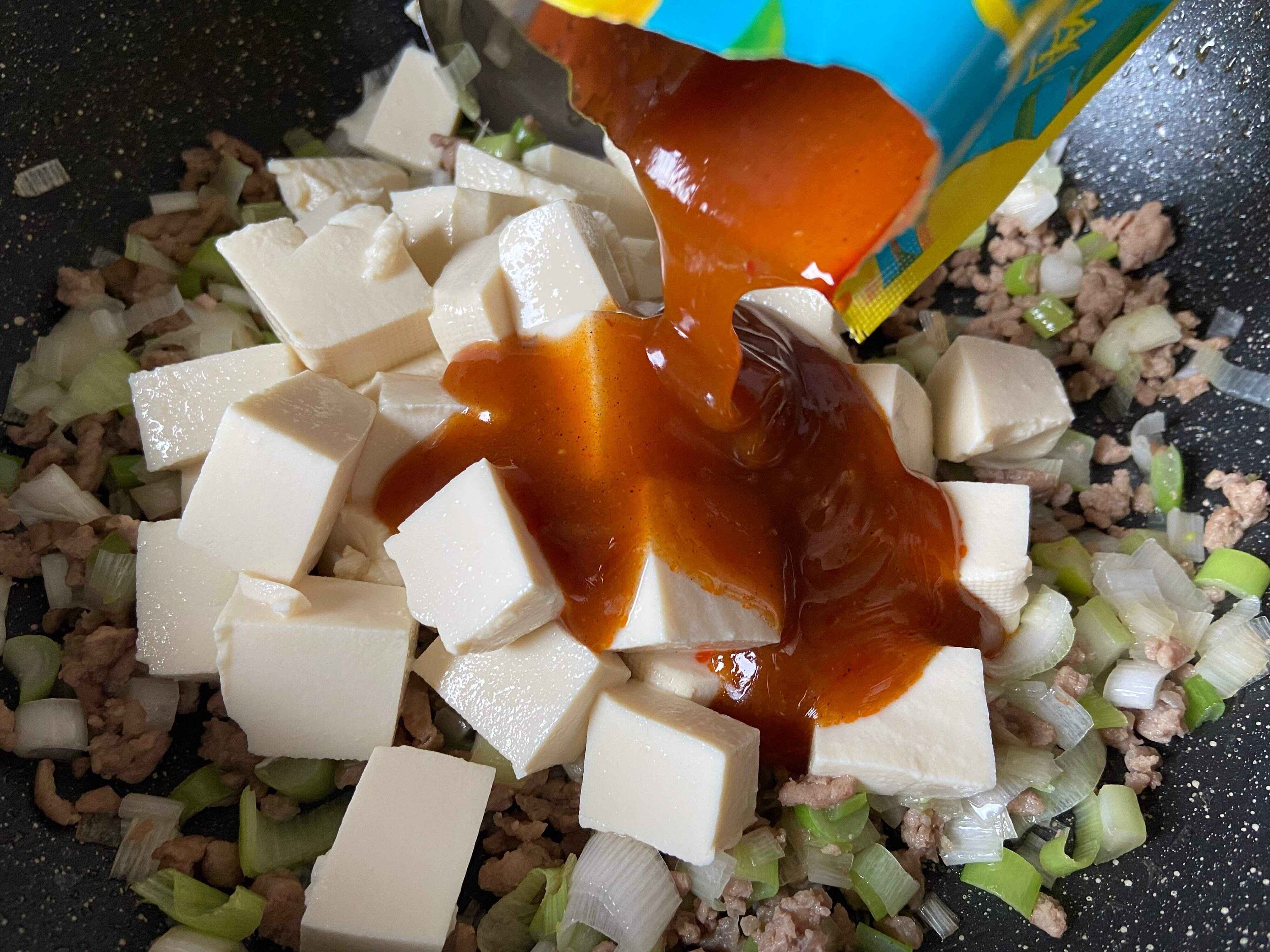 つくり方は簡単、フライパンで豚ひき肉、刻んだ長ネギをしっかり炒めてさいの目にカットした豆腐を1丁入れます。そこにレモン麻婆豆腐の素を1袋全量かけます。