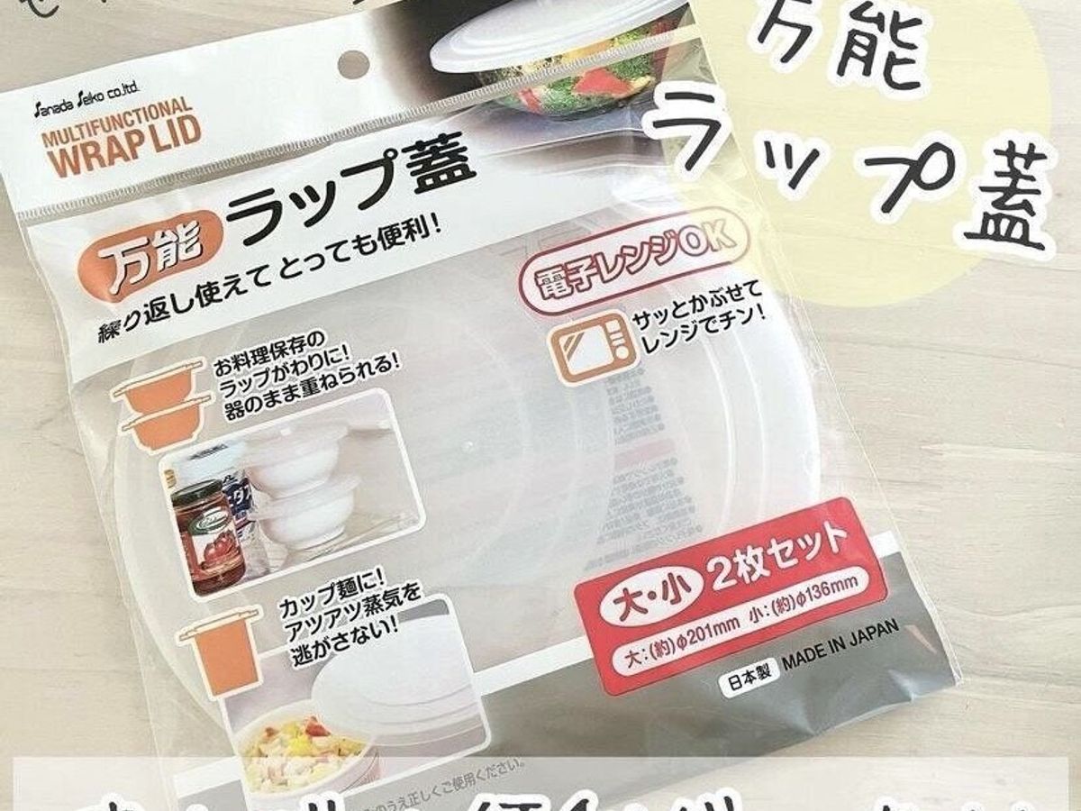 繰り返し使えて便利!と話題なのが、ラップの代わりに使える「万能ラップ蓋」(110円)。大・小の2サイズが入っています。ポリプロピレン製でペラペラせずしっかりした作りになっているため、洗いやすいとのこと。耐熱温度は140℃、耐冷温度は−20℃と電子レンジや冷蔵庫で使えるところもうれしいですね。カップ麺の蓋として使うことも!ラップの節約、エコにもなって◎。