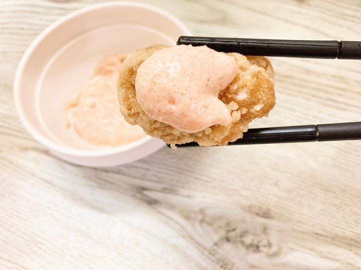 明太子とマヨネーズを混ぜたソースを温めたCP 竜田揚げにかけるだけの簡単なのに、間違いないおいしさのレシピ。