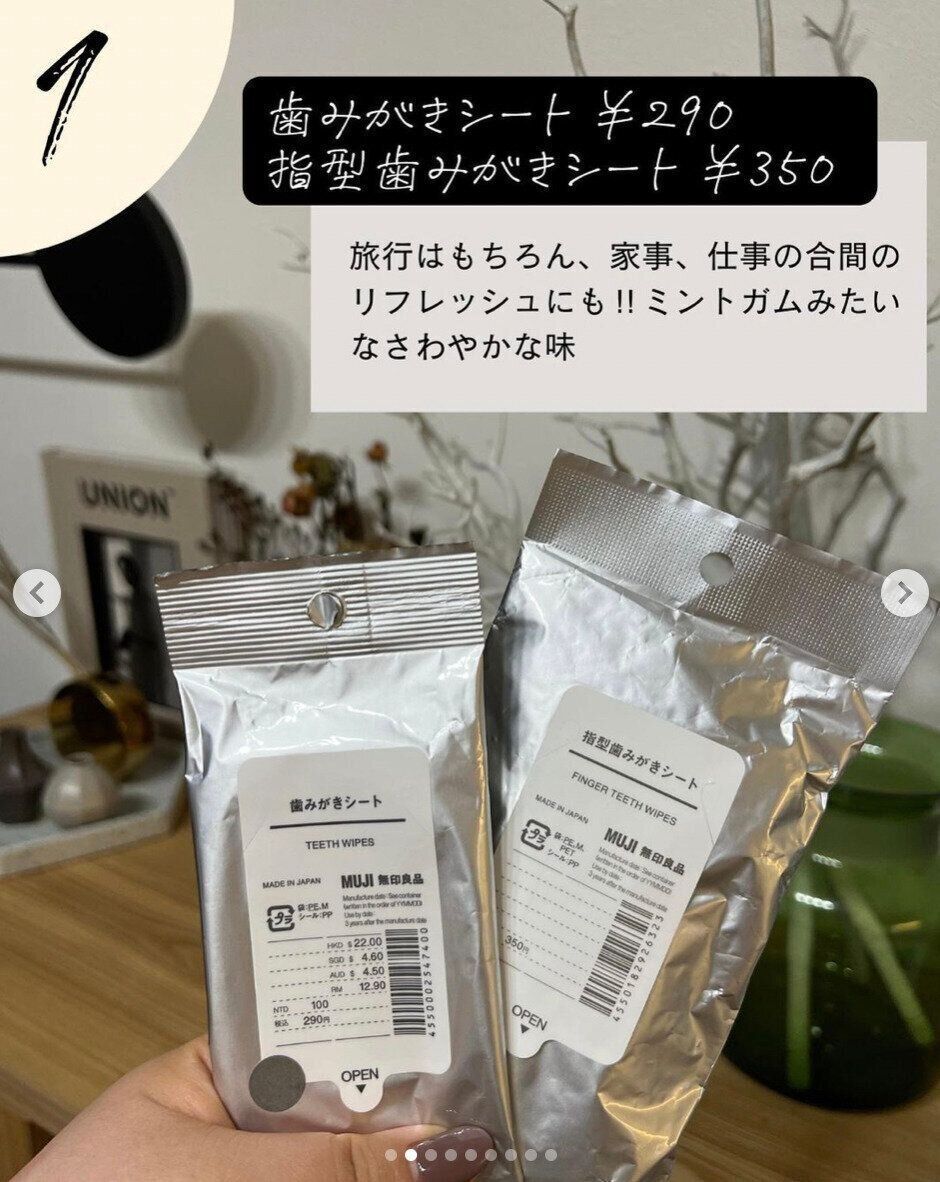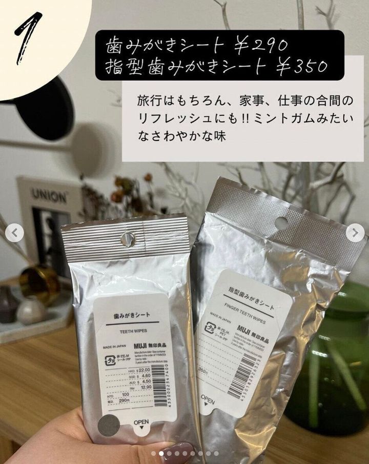 無印にこんなアイテムがあるのをご存知でしょうか。歯ブラシを持っていないときや水が使えないときにさっと使える歯みがきシートです。旅行に持っていったり、非常用として備えておいてもいいかもしれませんね。すっきりとしたミント風味です。歯みがきシートは290円、指型歯みがきシートは350円です。