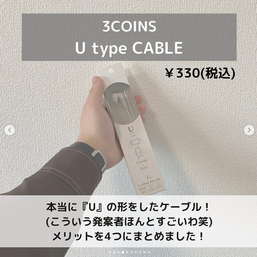 スマホの充電中、ケーブルが邪魔ですよね…。でも「しょうがないか」と諦めるのはまだ早いです!3COINSの300円商品「Utype CABLE」がそのプチストレスを解消してくれます。根元がU字になっているためケーブルが自然にスマホにフィット。持ちやすく置きやすい構造になっています。急速充電も対応しているので、お手持ちの機器にあった端子のものを選んでみてくださいね。