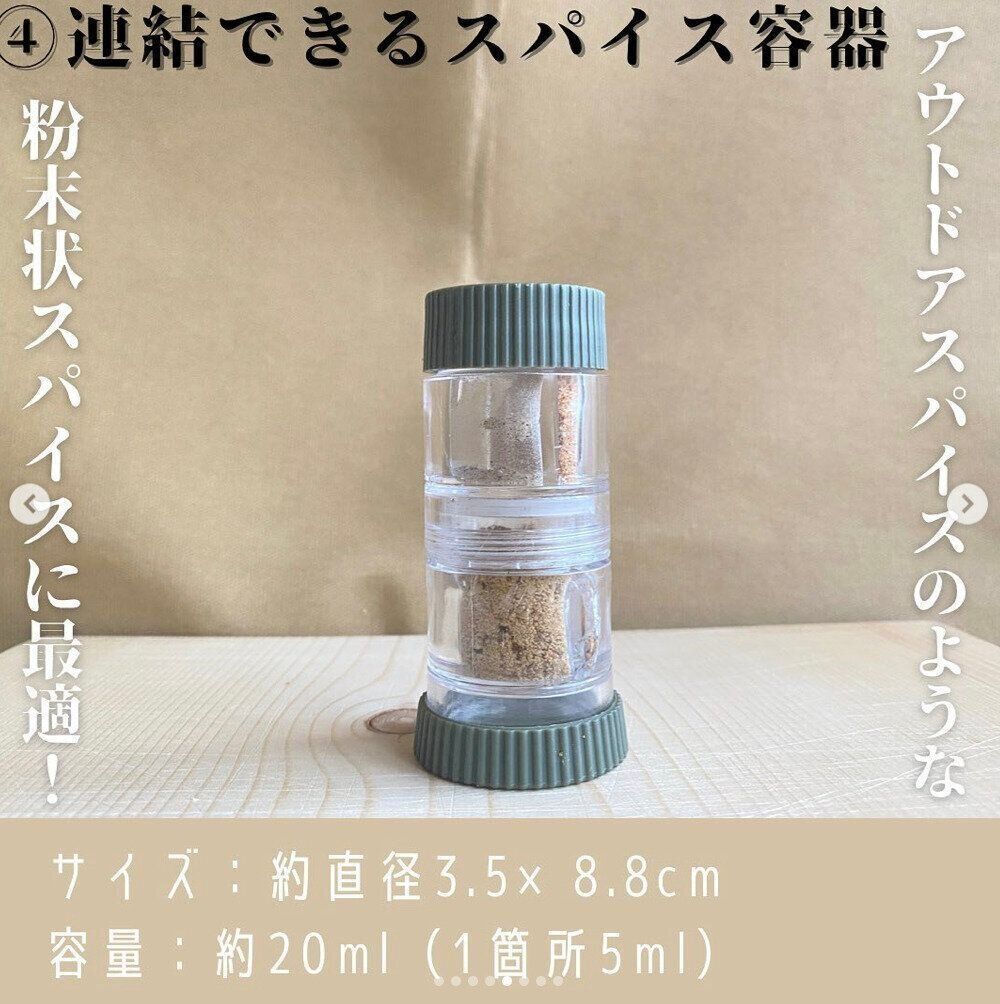こちらはアウトドアにおすすめなスパイス容器。容器は1つあたり5mlと少量ですが、アウトドアにはちょうどいいですね。容器の真ん中に仕切りがあるので、1つの容器の中に2種類のスパイスを入れることができます。また、スクリュータイプで簡単に連結が可能です。こんな高機能アイテムも110円で買えちゃいます!