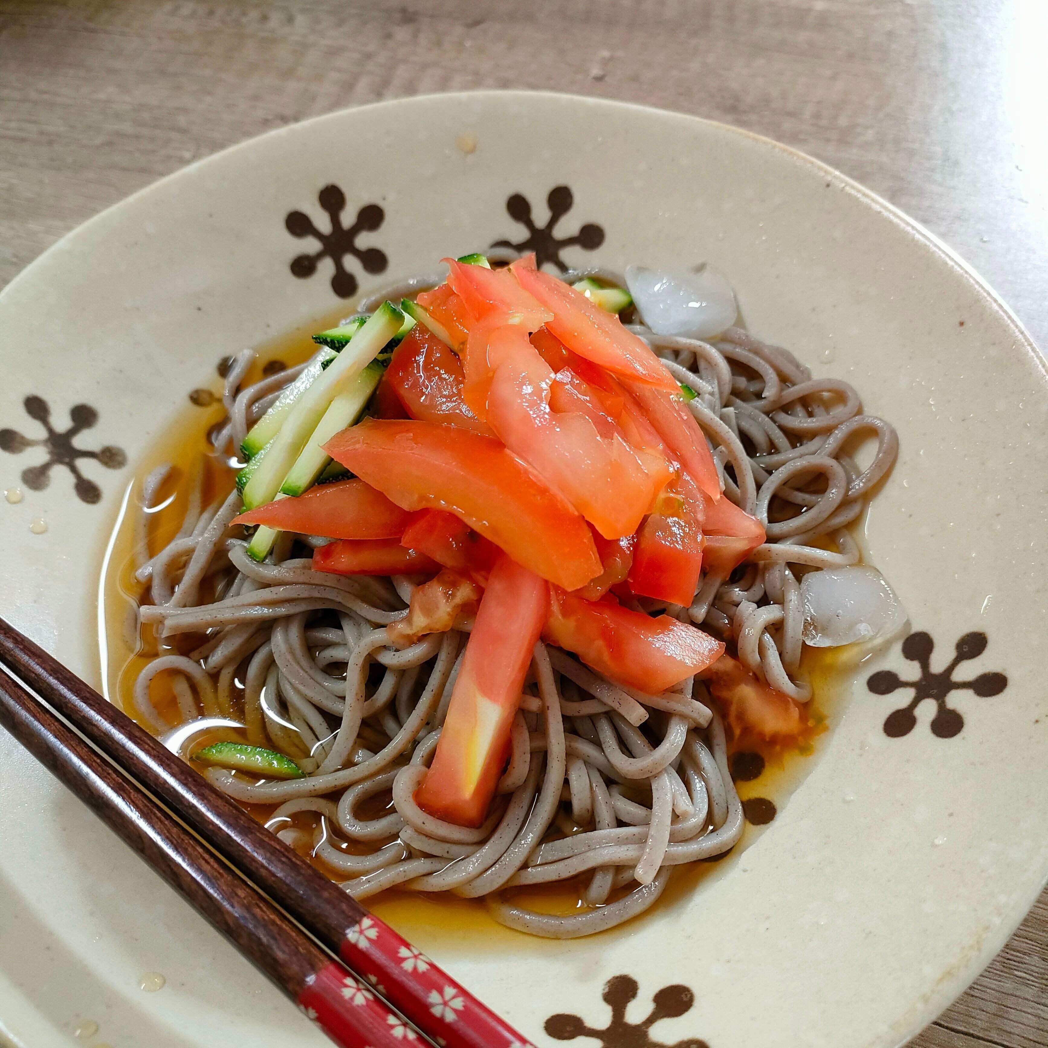 そばはお湯で30秒ほどさっと湯でて水で洗い、カットしたトマトとズッキーニをのせてめんつゆをぶっかけしました。調理時間5分でできる簡単ごはんです。