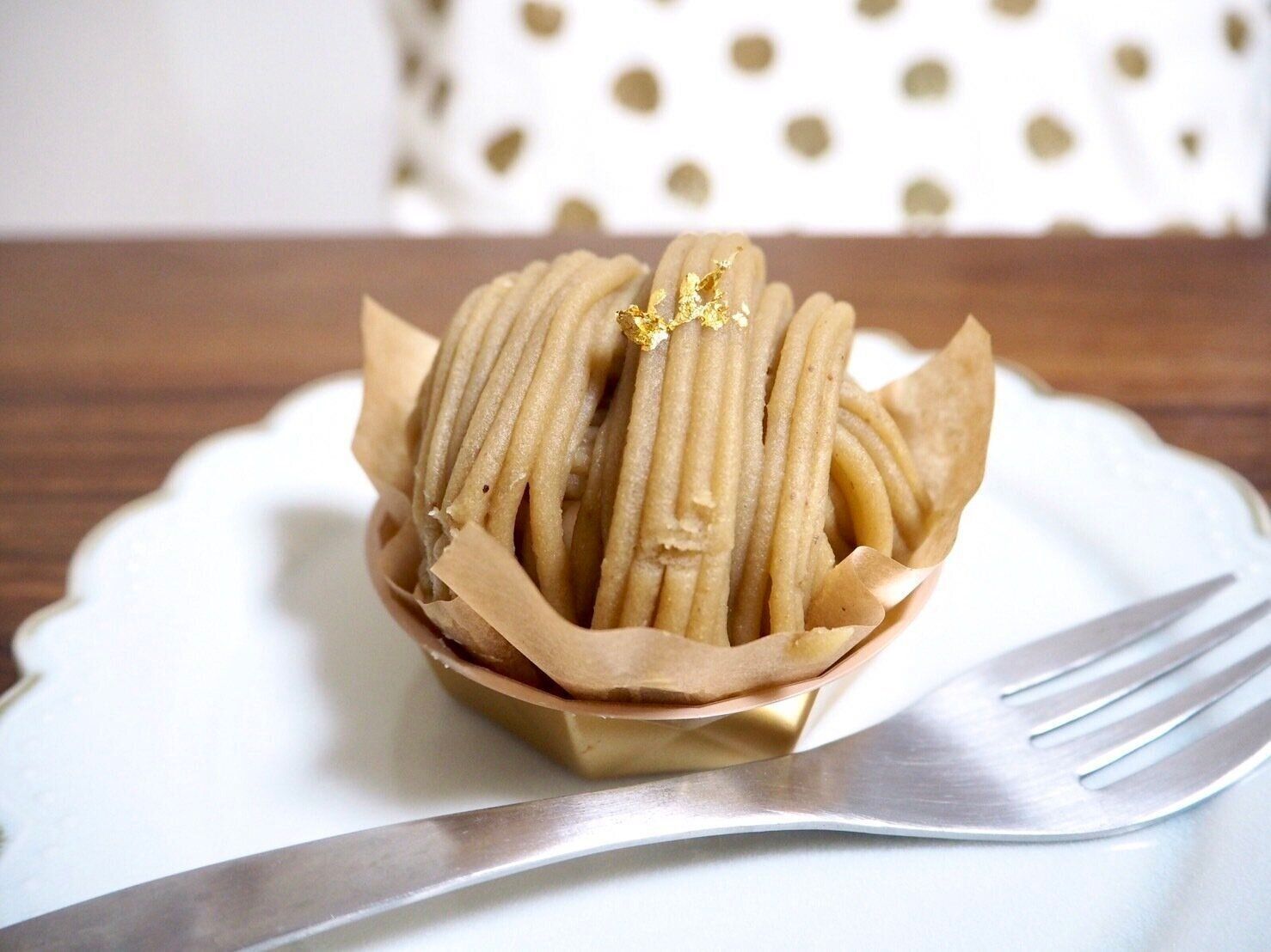まさかの金箔がのっている「国産和栗のモンブラン」、値段は1つあたり594円です。