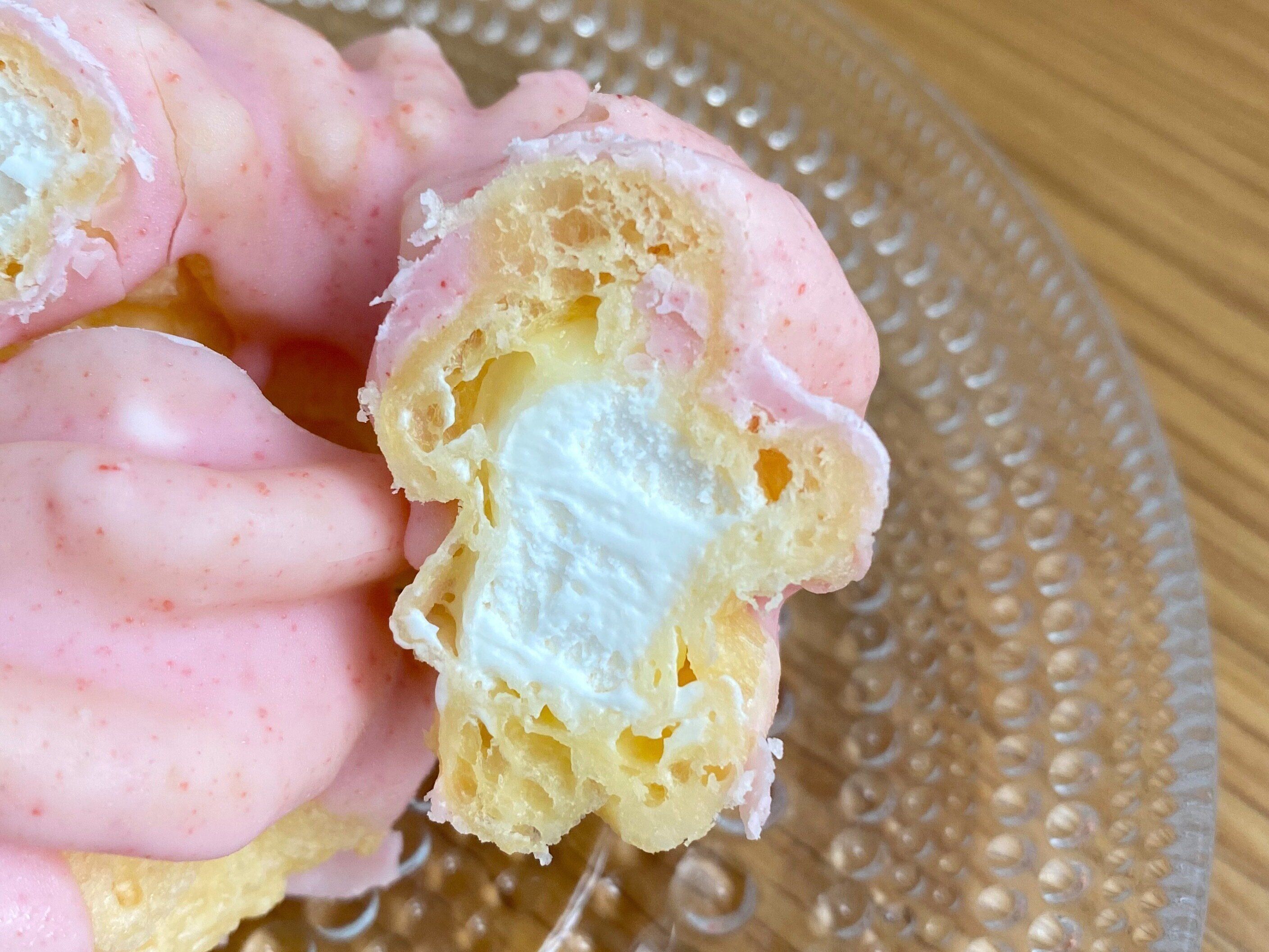 「イチゴチョコフレンチクルーラー」は、単品販売ではイチゴ味のホイップクリームが入っていますが、アソートタイプはシンプルなホイップクリームになっています。