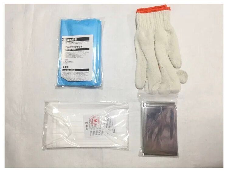 「非常持ち出し4点セット」(550円)はアルミブランケット、軍手、マスク、携帯トイレがポーチに入った状態でセット販売されています。