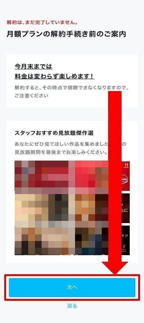 現時点で解約は完了していません。そのまま「次へ」のボタンを選択しましょう。