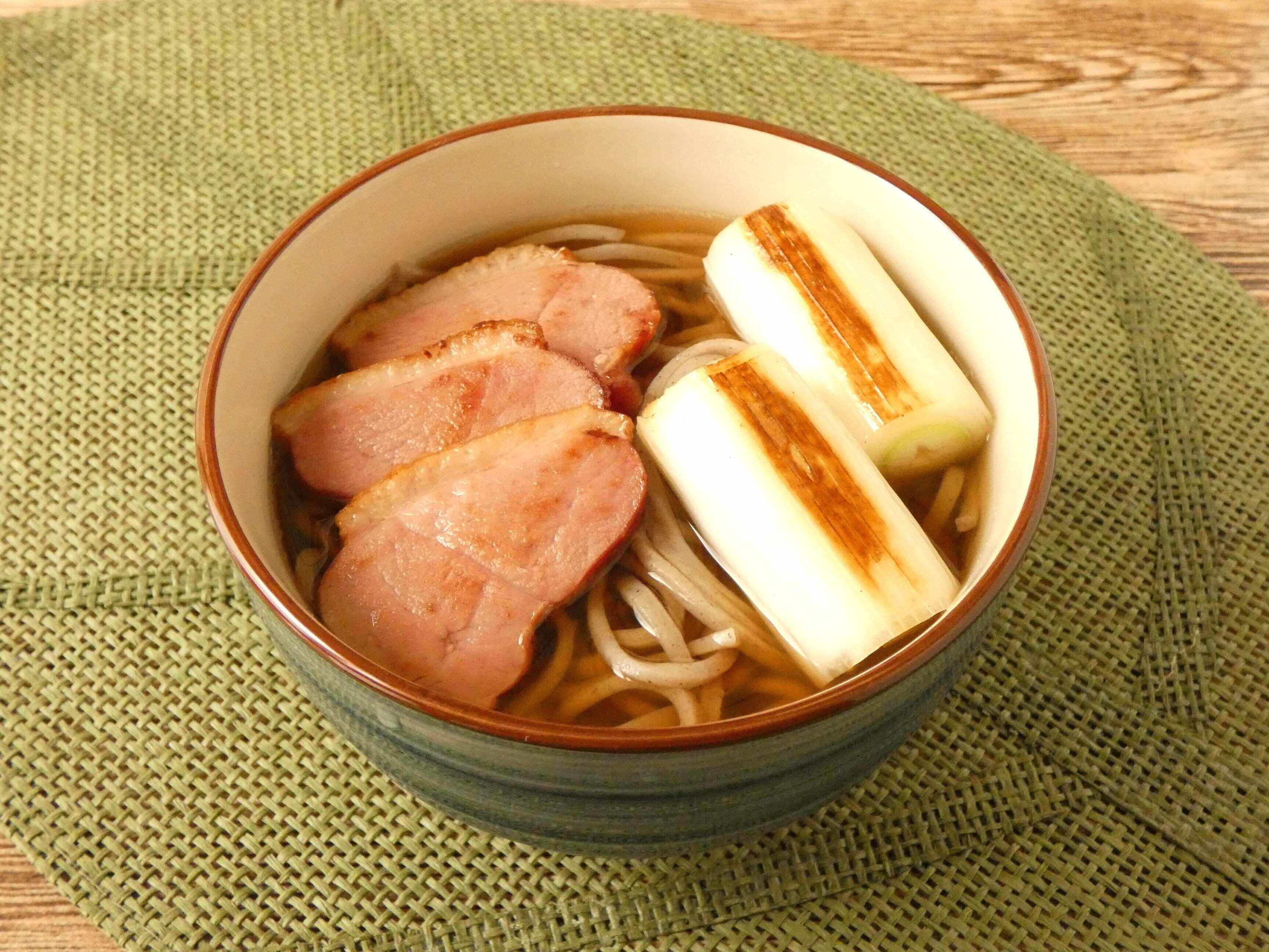 めんつゆと水でそばつゆを作ります。長ねぎは4cm位の長さに切り、フライパンで転がしながら焼いて焼き色をつけたらそばつゆに入れて火を通します。そばを茹でて器に盛り、そばつゆと長ねぎ、薄くスライスした合鴨ロースを乗せれば完成。合鴨も軽く焼いて乗せると香ばしさがアップします。